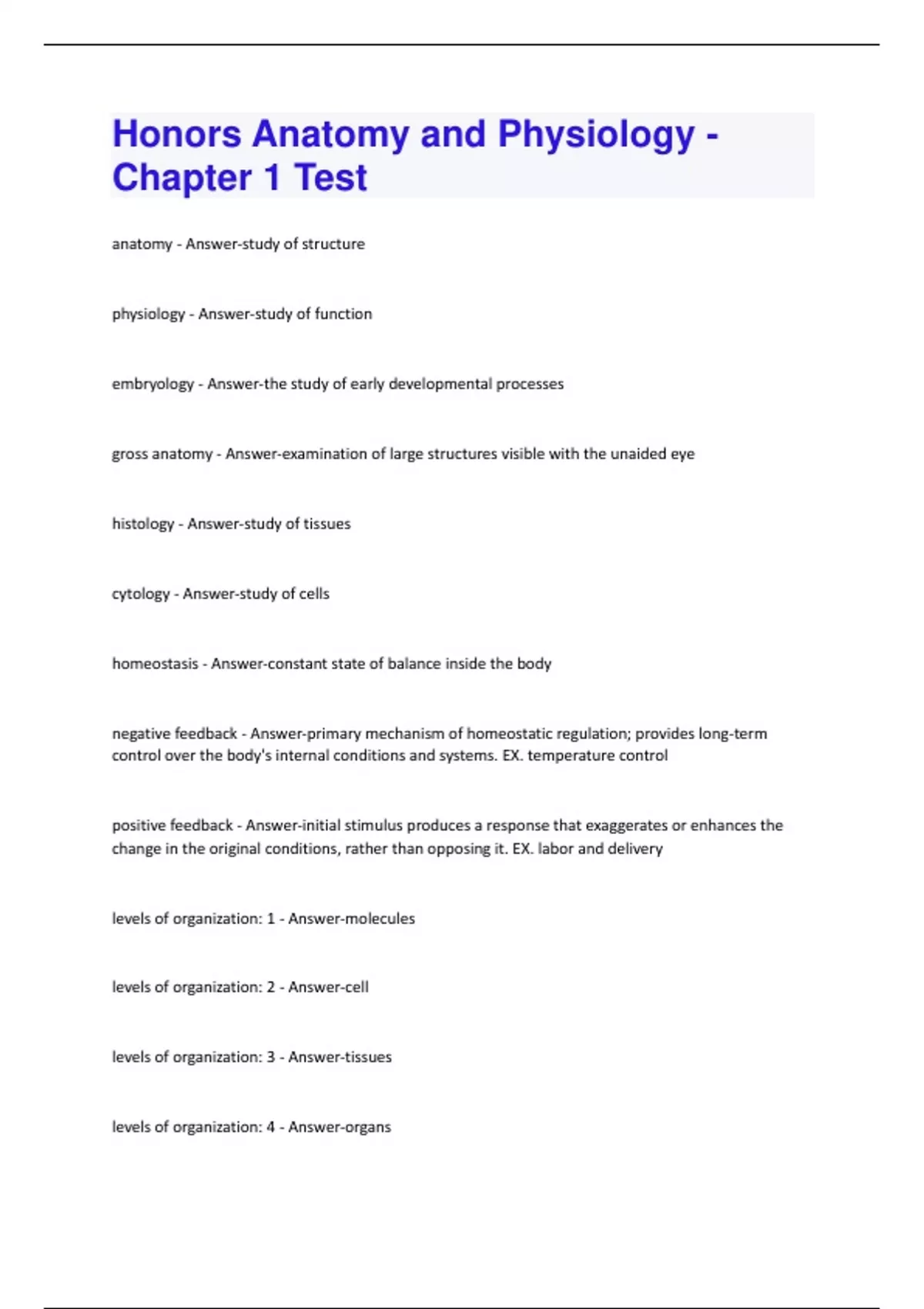 Honors Anatomy and Physiology - Chapter 1 Test Questions With 100% Correct Answers!!