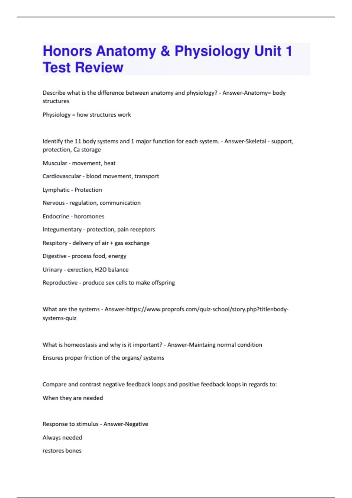 Honors Anatomy & Physiology Unit 1 Test Review Questions And Answers Already Graded A+