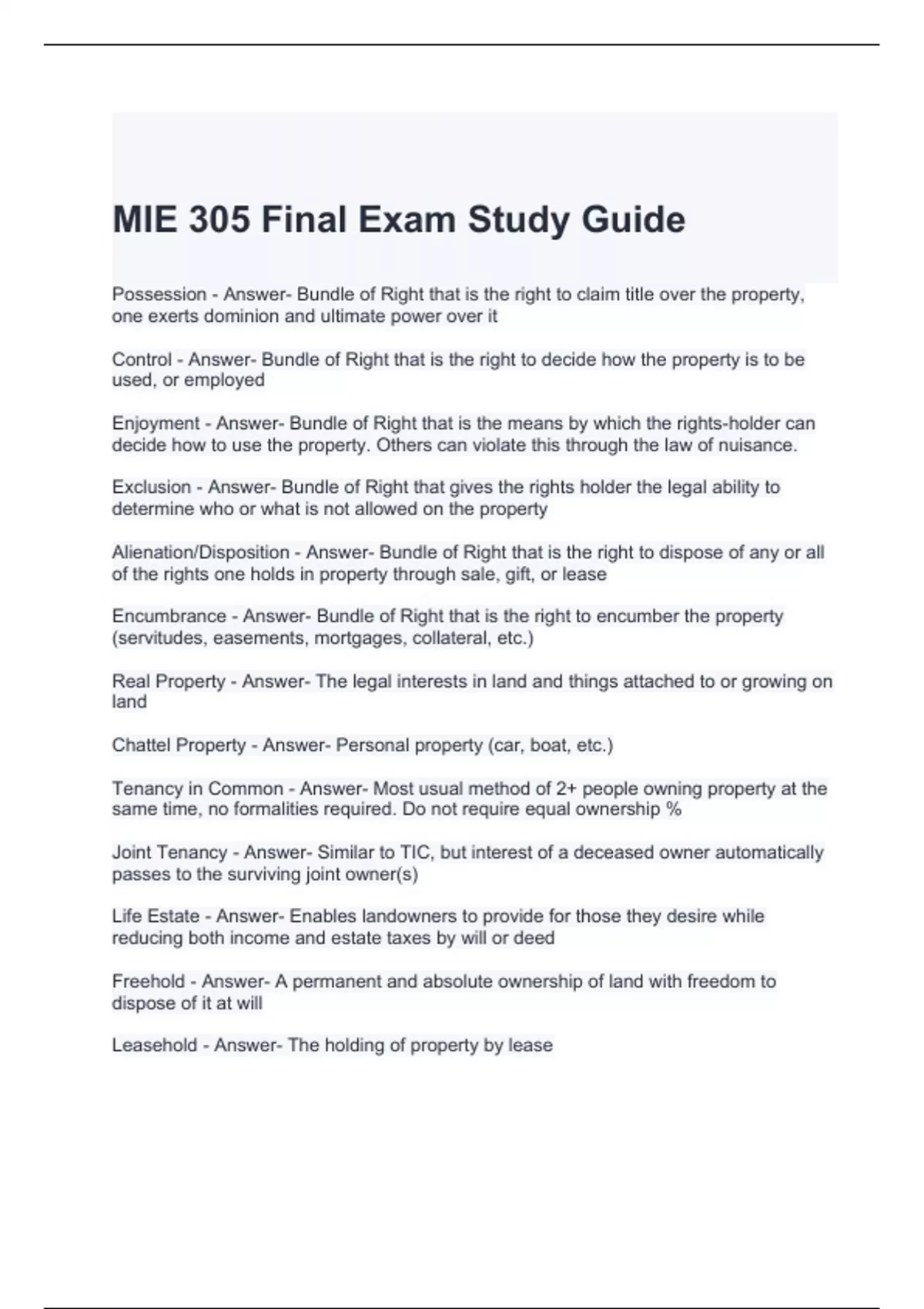 MIE 305 Final Exam Study Guide Questions with correct Answers