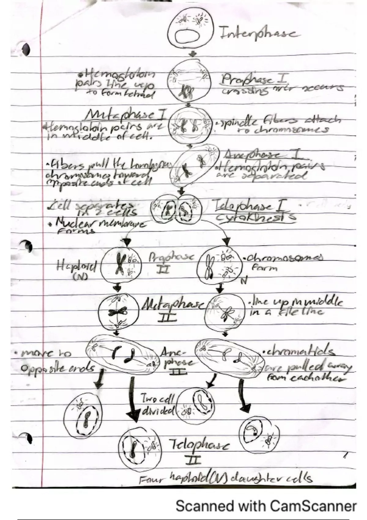 This documents portrays meiosis 1 and 2 drawn out, with descriptions for every phase, interphase, prophase 1 and 2, metaphase 1 and 2, anaphase 1 and 2 telophase 1 and 2 as well as cytokinesis.