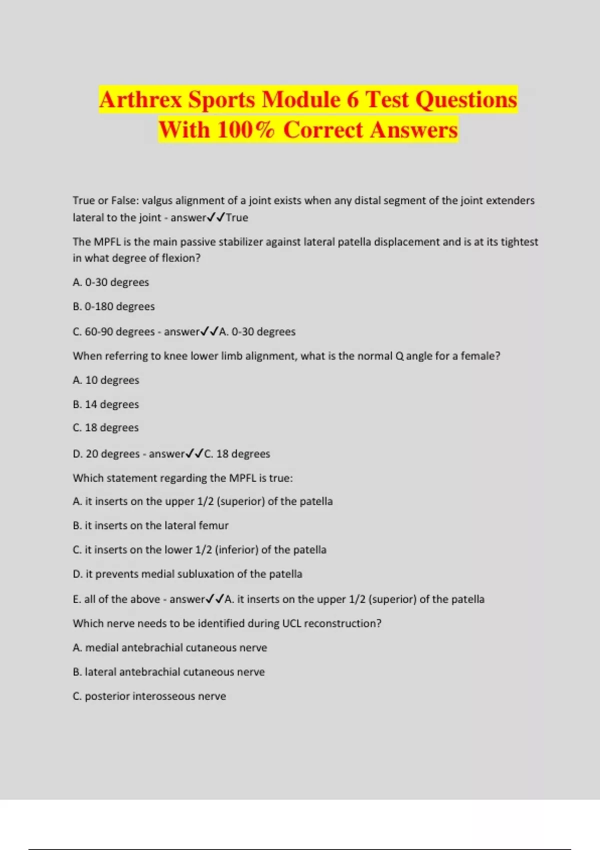 Arthrex Sports Module 6 Test Questions With 100% Correct Answers True or False: valgus alignment of a joint exists when any distal segment of the joint extenders lateral to the joint - answerTrue The MPFL is the main passive stabilizer against lateral patella displacement and is at its tightest in what degree of flexion? A. 0-30 degrees B. 0-180 degrees C. 60-90 degrees - answerA. 0-30 degrees When referring to knee lower limb alignment, what is the normal Q angle for a female? A. 10 degrees B. 14 degrees C. 18 degrees D. 20 degrees - answerC. 18 degrees Which statement regarding the MPFL is true: A. it inserts on the upper 1/2 (superior) of the patella B. it inserts on the lateral femur C. it inserts on the lower 1/2 (inferior) of the patella D. it prevents medial subluxation of the patella E. all of the above - answerA. it inserts on the upper 1/2 (superior) of the patella Which nerve needs to be identified during UCL reconstruction? A. medial antebrachial cutaneous nerve B. lateral antebrachial cutaneous nerve C. posterior interosseous nerve D. none of the above - answerA. medial antebrachial cutaneous nerve What is the necessary graft length when performing an Elbow UCL Reconstruction? A. 10-13 cm B. 11-16 cm C. 15-17 cm D. 18-20 cm - answerC. 15-17 cm The Ulnar collateral ligament attaches to what specific structure proximally at the humerus? A. lateral epicondyle B. medial epicondyle C. lateral supracondylar ridge D. medial supracondylar ridge E. capitullum - answerB. medial epicondyle During an Ulnar Collateral Ligament Reconstruction, which portion of the ligament is reconstructed? A. medial B. transverse C. anterior - answerC. anterior Which size is NOT available in the Autograft OATS 2.0 single-use set? A. 6 mm B. 8 mm C. 10 mm D. 12 mm E. all are available F. none of the above - answerD. 12 mm IOBP (IntraOsseous BioPlasty) can be a minimally invasive procedure used to treat: A. OCDs (osteochondral defects) B. Osteoarthritis