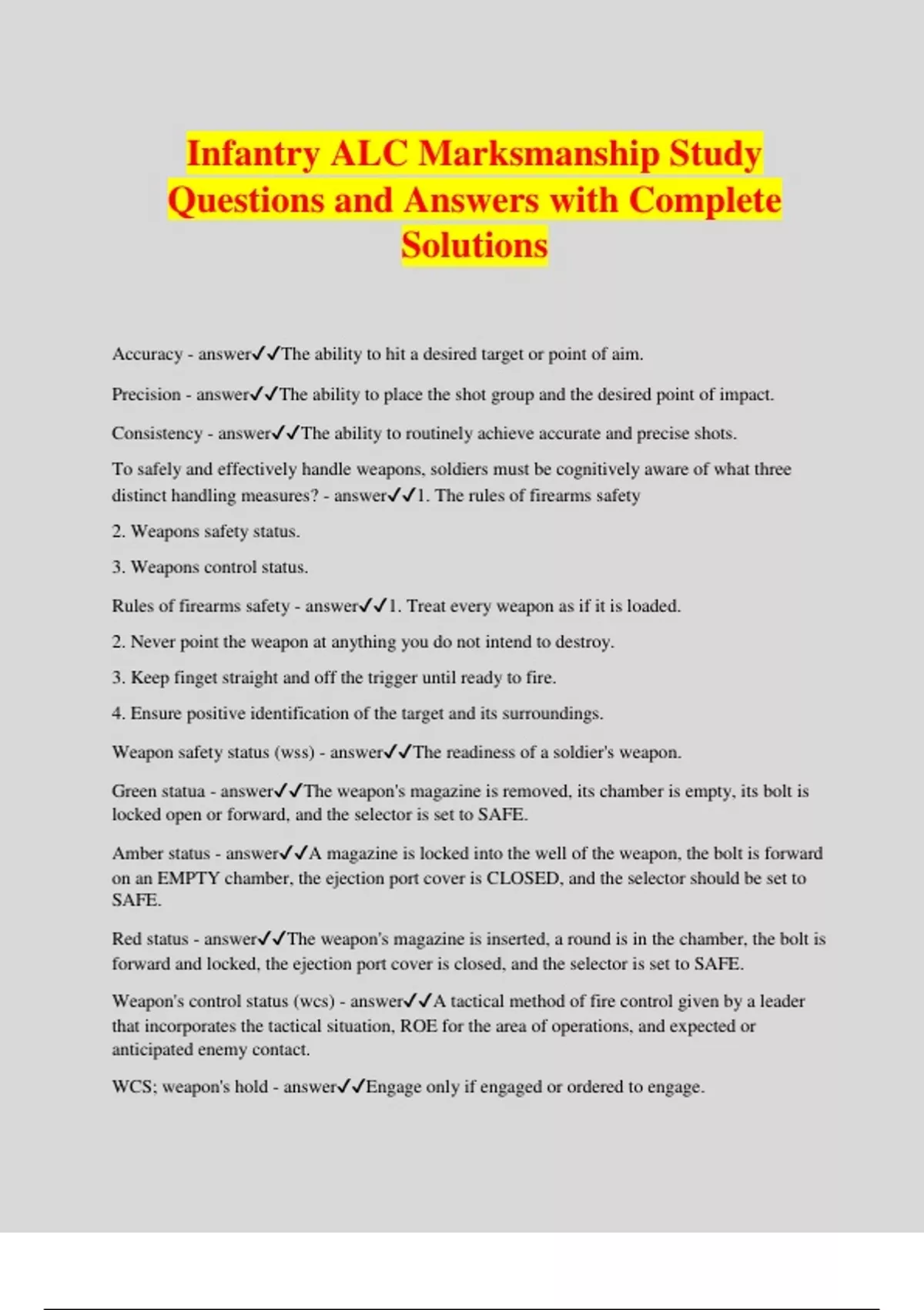 Infantry ALC Marksmanship Study Questions and Answers with Complete Solutions Accuracy - answerThe ability to hit a desired target or point of aim. Precision - answerThe ability to place the shot group and the desired point of impact. Consistency - answerThe ability to routinely achieve accurate and precise shots. To safely and effectively handle weapons, soldiers must be cognitively aware of what three distinct handling measures? - answer1. The rules of firearms safety 2. Weapons safety status. 3. Weapons control status. Rules of firearms safety - answer1. Treat every weapon as if it is loaded. 2. Never point the weapon at anything you do not intend to destroy. 3. Keep finget straight and off the trigger until ready to fire. 4. Ensure positive identification of the target and its surroundings. Weapon safety status (wss) - answerThe readiness of a soldier's weapon. Green statua - answerThe weapon's magazine is removed, its chamber is empty, its bolt is locked open or forward, and the selector is set to SAFE. Amber status - answerA magazine is locked into the well of the weapon, the bolt is forward on an EMPTY chamber, the ejection port cover is CLOSED, and the selector should be set to SAFE. Red status - answerThe weapon's magazine is inserted, a round is in the chamber, the bolt is forward and locked, the ejection port cover is closed, and the selector is set to SAFE. Weapon's control status (wcs) - answerA tactical method of fire control given by a leader that incorporates the tactical situation, ROE for the area of operations, and expected or anticipated enemy contact. WCS; weapon's hold - answerEngage only if engaged or ordered to engage.