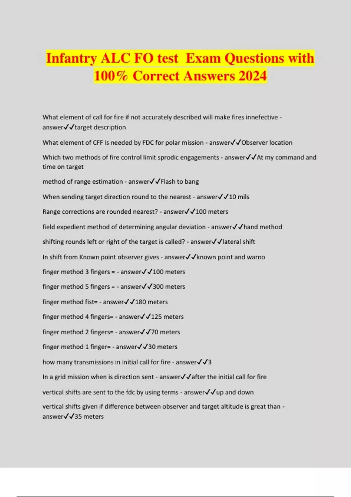 Infantry ALC FO test Exam Questions with 100% Correct Answers 2024 What element of call for fire if not accurately described will make fires innefective - answertarget description What element of CFF is needed by FDC for polar mission - answerObserver location Which two methods of fire control limit sprodic engagements - answerAt my command and time on target method of range estimation - answerFlash to bang When sending target direction round to the nearest - answer10 mils Range corrections are rounded nearest? - answer100 meters field expedient method of determining angular deviation - answerhand method shifting rounds left or right of the target is called? - answerlateral shift In shift from Known point observer gives - answerknown point and warno finger method 3 fingers = - answer100 meters finger method 5 fingers = - answer300 meters finger method fist= - answer180 meters finger method 4 fingers= - answer125 meters finger method 2 fingers= - answer70 meters finger method 1 finger= - answer30 meters how many transmissions in initial call for fire - answer3 In a grid mission when is direction sent - answerafter the initial call for fire vertical shifts are sent to the fdc by using terms - answerup and down vertical shifts given if difference between observer and target altitude is great than - answer35 meter