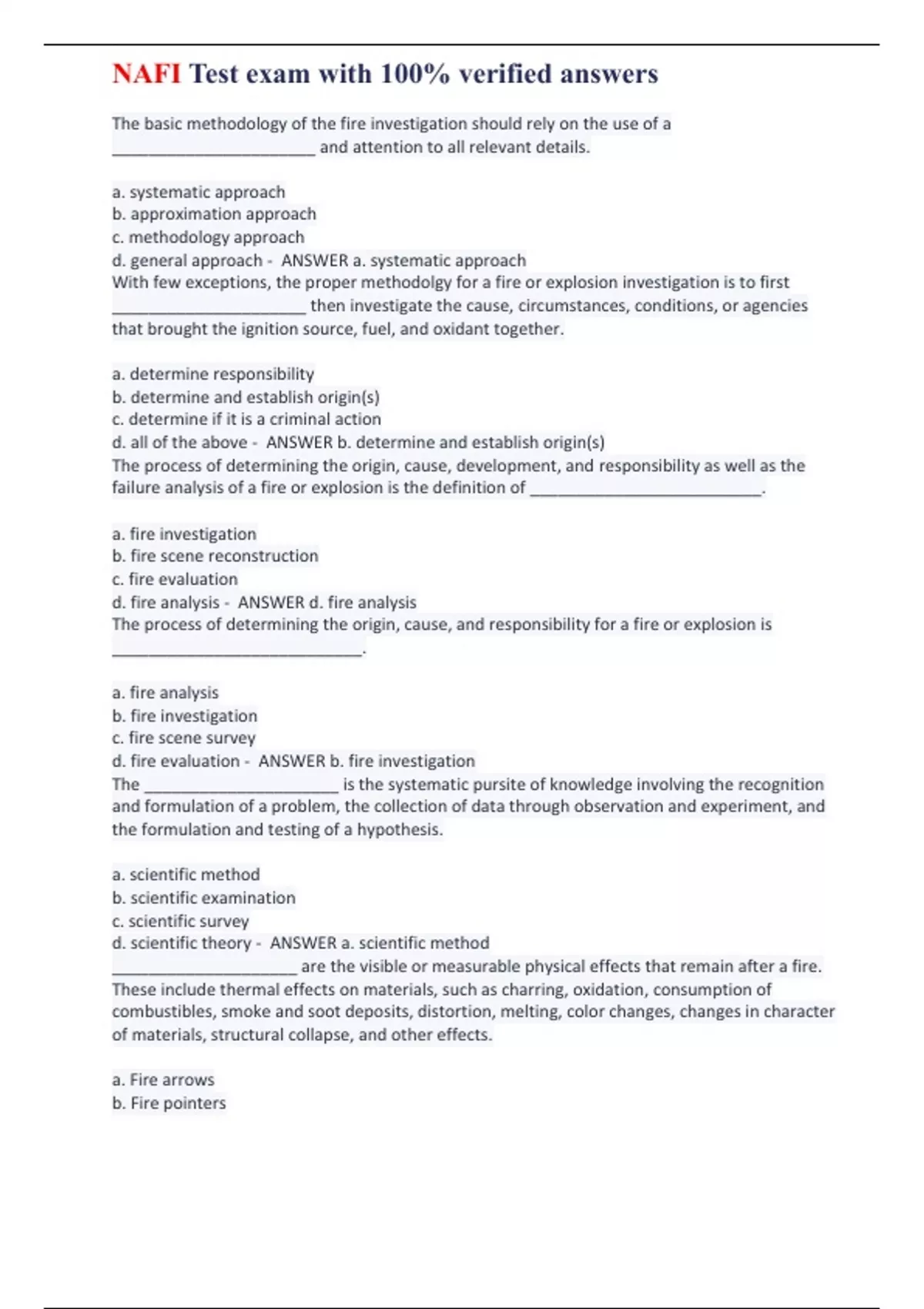 The basic methodology of the fire investigation should rely on the use of a ______________________ and attention to all relevant details. a. systematic approach b. approximation approach c. methodology approach d. general approach - ANSWER a. systematic approach With few exceptions, the proper methodolgy for a fire or explosion investigation is to first _____________________ then investigate the cause, circumstances, conditions, or agencies that brought the ignition source, fuel, and oxidant together. a. determine responsibility b. determine and establish origin(s) c. determine if it is a criminal action d. all of the above - ANSWER b. determine and establish origin(s) The process of determining the origin, cause, development, and responsibility as well as the failure analysis of a fire or explosion is the definition of _________________________. a. fire investigation b. fire scene reconstruction c. fire evaluation d. fire analysis - ANSWER d. fire analysis The process of determining the origin, cause, and responsibility for a fire or explosion is ___________________________. a. fire analysis b. fire investigation c. fire scene survey d. fire evaluation - ANSWER b. fire investigation The _____________________ is the systematic pursite of knowledge involving the recognition and formulation of a problem, the collection of data through observation and experiment, and the formulation and testing of a hypothesis. a. scientific method b. scientific examination c. scientific survey d. scientific theory - ANSWER a. scientific method ____________________ are the visible or measurable physical effects that remain after a fire. These include thermal effects on materials, such as charring, oxidation, consumption of combustibles, smoke and soot deposits, distortion, melting, color changes, changes in character of materials, structural collapse, and other effects. a. Fire arrows b. Fire pointers