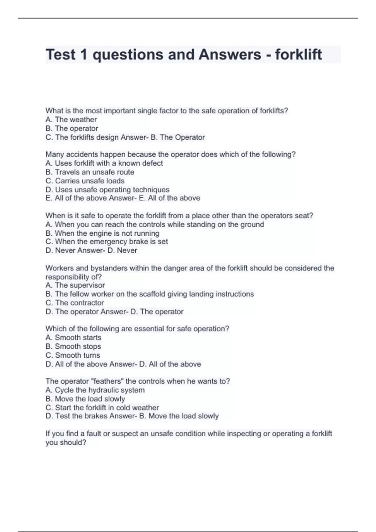 Test 1 questions and Answers - forklift