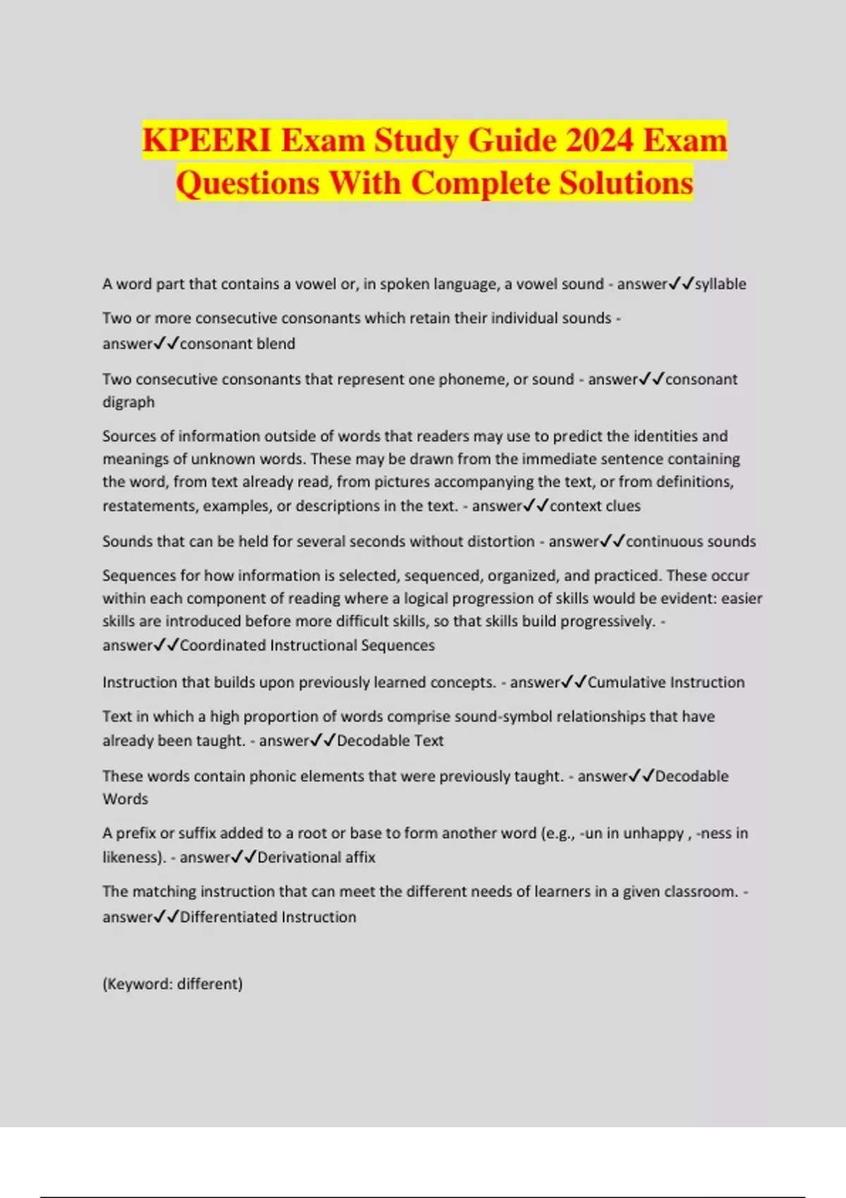KPEERI Exam Study Guide 2024 Exam Questions With Complete Solutions A word part that contains a vowel or, in spoken language, a vowel sound - answersyllable Two or more consecutive consonants which retain their individual sounds - answerconsonant blend Two consecutive consonants that represent one phoneme, or sound - answerconsonant digraph Sources of information outside of words that readers may use to predict the identities and meanings of unknown words. These may be drawn from the immediate sentence containing the word, from text already read, from pictures accompanying the text, or from definitions, restatements, examples, or descriptions in the text. - answercontext clues Sounds that can be held for several seconds without distortion - answercontinuous sounds Sequences for how information is selected, sequenced, organized, and practiced. These occur within each component of reading where a logical progression of skills would be evident: easier skills are introduced before more difficult skills, so that skills build progressively. - answerCoordinated Instructional Sequences Instruction that builds upon previously learned concepts. - answerCumulative Instruction Text in which a high proportion of words comprise sound-symbol relationships that have already been taught. - answerDecodable Text These words contain phonic elements that were previously taught. - answerDecodable Words A prefix or suffix added to a root or base to form another word (e.g., -un in unhappy , -ness in likeness). - answerDerivational affix The matching instruction that can meet the different needs of learners in a given classroom. - answerDifferentiated Instruction (Keyword: different) A group of two consecutive letters whose phonetic value is a single sound (e.g., /ea/ in bread; /ch/ in chat; /ng/ in sing) - answerDigraph (Remember the word digraph has a digraPH) A vowel produced by the tongue shifting position during articulation; a vowel that feels as if it has two parts, especially the vowels spelled ow, oy, ou, and oi. - answerDipthong (Remember the sentence, "wOW, yOU look good in that thong (diphthong)! :) The teacher defines and teaches a concept, guides students through its application, and arranges for extended guided practice until mastery is achieved. - answerDirect Instruction Planned instruction to pre-teach new, important, and difficult words to ensure the quantity and quality of exposures to words that students will encounter in their reading. - answerDirect Vocabulary Instruction Strategies that help students engage the meanings of a text (e.g., asking questions at critical junctures; modeling the thought process used to make inferences; constructing mental imagery). - answerDuring Reading Comprehension Strategies A language-based disability that affects both oral and written language. It may also be referred to as reading disability, reading difference, or reading disorder. - answerDyslexia A part of writing and preparing presentations concerned chiefly with improving the clarity, organization, concision, and correctness of expression relative to task, purpose, and audience; compared to revising, a smaller-scale activity often associated with surface aspects of a text. - answerEditing A framework used during phonemic awareness instruction. These are sometimes referred to as Sound Boxes. When working with words, the teacher can draw one box per sound for a target word. Students push a marker into one box as they segment each sound in the word. - answerElkonin Boxes The skills, knowledge, and attitudes that are developmental precursors to conventional forms of reading and writing. - answerEmergent Literacy The ability to translate language into print (writing) is ____________. - answerEncoding (Remember prefix en- means "put into", you are putting sounds into print). Students whose first language is not English and who are in the process of learning English. - answerEnglish Language Learner The origin of a word and the historical development of its meaning is called ________________. - answerEtymology This type of instruction is step-by-step, and the actions of the teacher are clear, specific, direct, and related to the learning objective. - answerExplicit Instruction (Remember, explicit means something is "expressed clearly") Reports factual information (also referred to as informational text) and the relationships among ideas. This type of text tends to be more difficult for students than narrative text because of the density of long, difficult, and unknown words or word parts. - answerExpository text (Remember, Expository is writing that seeks to EXplain and Inform) Language that is spoken. - answerExpressive Language Language that departs from its literal meaning (e.g., The snow sparkled like diamonds; That child is a handful.). - answerFigurative meanings What are the 5 components of Reading? - answerPhonemic awareness, phonics, fluency, vocabulary, and comprehension. Grouping students according to shared instructional needs and abilities and regrouping as their instructional needs change. Group size and allocated instructional time may vary among groups. - answerFlexible grouping Words of one syllable, ending in "f", "l", "z" or "s" - after one vowel is called the ______________ ______________. - answerFloss/ SAMMY Rule The ability to read a text accurately, quickly, and with proper expression and comprehension. - answerFluency Follows a prescribed format for administration and scoring. Scores obtained from these types of tests are standardized, meaning that interpretation is based on norms from a comparative sample of children. - answerFormal Assessments (Remember, Formal means having a conventionally recognized form, structure, or set of rules- standardized) The level at which a reader reads at less than a 90% accuracy - answerFrustrational Reading Level Vocabulary common to written texts but not commonly a part of speech; in the Standards, these words and phrases are analogous to Tier Two 