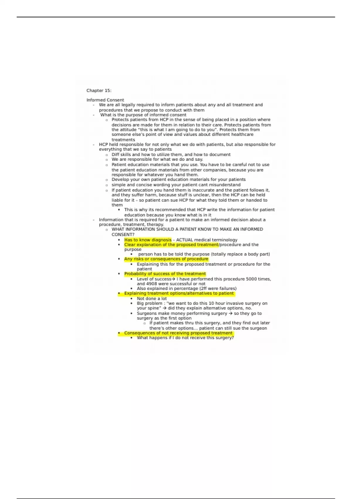 This is a comprehensive and detailed note for Hlth 3315, with focus on Chapter 15; informed consent.