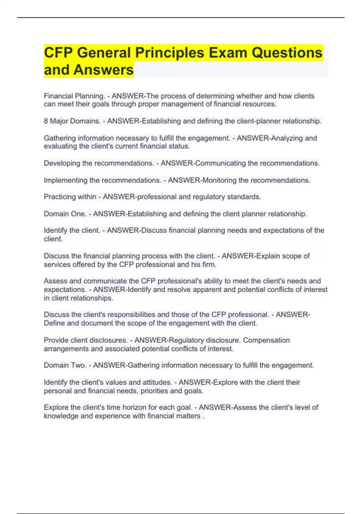 Financial Planning. - ANSWER-The process of determining whether and how clients can meet their goals through proper management of financial resources. 8 Major Domains. - ANSWER-Establishing and defining the client-planner relationship. Gathering information necessary to fulfill the engagement. - ANSWER-Analyzing and evaluating the client's current financial status. Developing the recommendations. - ANSWER-Communicating the recommendations. Implementing the recommendations. - ANSWER-Monitoring the recommendations. Practicing within - ANSWER-professional and regulatory standards. Domain One. - ANSWER-Establishing and defining the client planner relationship. Identify the client. - ANSWER-Discuss financial planning needs and expectations of the client. Discuss the financial planning process with the client. - ANSWER-Explain scope of services offered by the CFP professional and his firm. Assess and communicate the CFP professional's ability to meet the client's needs and expectations. - ANSWER-Identify and resolve apparent and potential conflicts of interest in client relationships. Discuss the client's responsibilities and those of the CFP professional. - ANSWER-Define and document the scope of the engagement with the client. Provide client disclosures. - ANSWER-Regulatory disclosure. Compensation arrangements and associated potential conflicts of interest. Domain Two. - ANSWER-Gathering information necessary to fulfill the engagement. Identify the client's values and attitudes. - ANSWER-Explore with the client their personal and financial needs, priorities and goals. Explore the client's time horizon for each goal. - ANSWER-Assess the client's level of knowledge and experience with financial matters .
