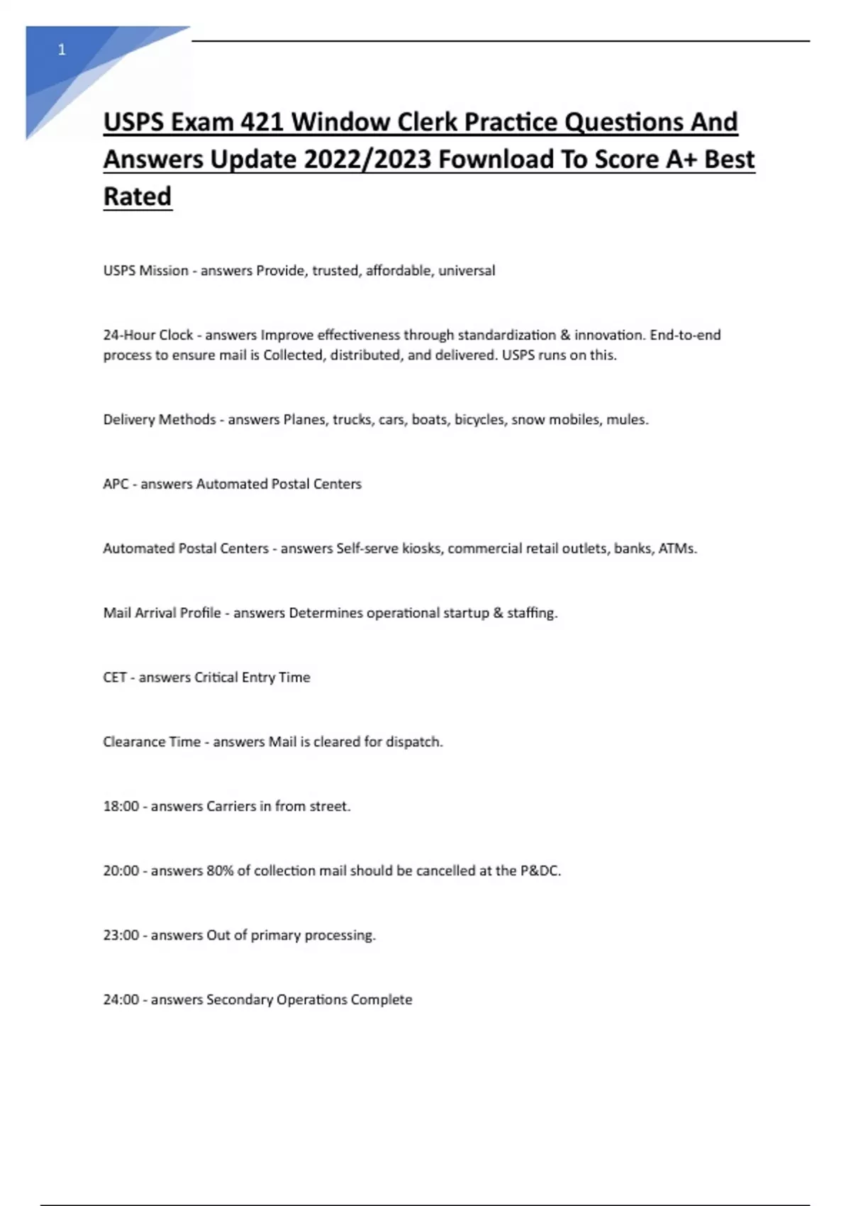 USPS Exam 421 Window Clerk Practice Questions And Answers Update 2022/2023 Fownload To Score A+ Best Rated