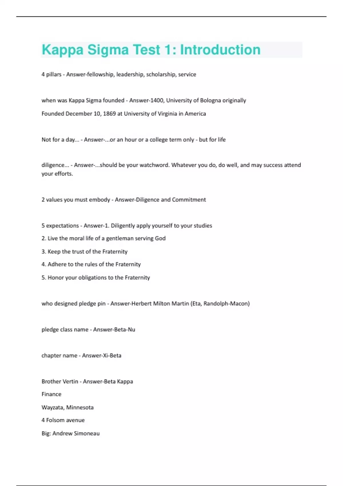 4 pillars - Answer-fellowship, leadership, scholarship, service when was Kappa Sigma founded - Answer-1400, University of Bologna originally Founded December 10, 1869 at University of Virginia in America Not for a day... - Answer-...or an hour or a college term only - but for life diligence... - Answer-...should be your watchword. Whatever you do, do well, and may success attend your efforts. 2 values you must embody - Answer-Diligence and Commitment 5 expectations - Answer-1. Diligently apply yourself to your studies 2. Live the moral life of a gentleman serving God 3. Keep the trust of the Fraternity 4. Adhere to the rules of the Fraternity 5. Honor your obligations to the Fraternity who designed pledge pin - Answer-Herbert Milton Martin (Eta, Randolph-Macon) pledge class name - Answer-Beta-Nu chapter name - Answer-Xi-Beta Brother Vertin - Answer-Beta Kappa Finance Wayzata, Minnesota 4 Folsom avenue Big: Andrew SimoneauBrother Barciela-Mrongowius - Answer-Beta Kappa Miami, Florida Business and economics 8 Cherokee street Big: Sterling Gregg Brother Galebe - Answer-Beta Iota Economics and Business 8 Cherokee Street Big: Felipe Machado Boca Raton, Florida 5 friends who founded Kappa Sigma in America - Answer-1. William Grigsby McCormick 2. Frank Courtney Nicodemus 3. Edmund Law Rogers 4. John Covert Boyd 5. George Miles Arnold Grand Master - Answer-Ryan Potechin Grand Procurator - Answer-Ryan Doucette Grand Master of Ceramonies - Answer-Kasey Chopra Grand Treasurer - Answer-Lucas Nelson-Madore Grand Scribe - Answer-David Lowsky District Grand Master - Answer-Erik RydeAlumnus Advisor - Answer-Justin A. Hansen Who lives at 23 cherokee - Answer-Leo Vergani, Sean Brown, Andrew Simoneau, Chris Haliwell, Miles Welch, Dasilva 8 Cherokee - Answer-Adolfo Barciela-Mrongowius, Stefena Galebe, James Wang, Nick Pandis, thanos, pedro 4 Folsom - Answer-Lachlan Vertin, Aidan Kelley, Bodhi Keith, Miles Pulvers, Jack Amoreno,