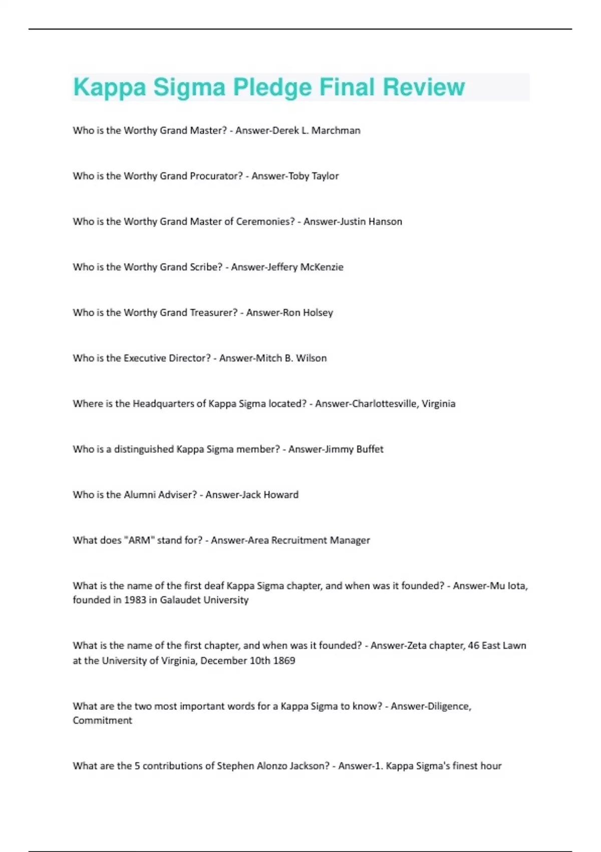 Who is the Worthy Grand Master? - Answer-Derek L. Marchman Who is the Worthy Grand Procurator? - Answer-Toby Taylor Who is the Worthy Grand Master of Ceremonies? - Answer-Justin Hanson Who is the Worthy Grand Scribe? - Answer-Jeffery McKenzie Who is the Worthy Grand Treasurer? - Answer-Ron Holsey Who is the Executive Director? - Answer-Mitch B. Wilson Where is the Headquarters of Kappa Sigma located? - Answer-Charlottesville, Virginia Who is a distinguished Kappa Sigma member? - Answer-Jimmy Buffet Who is the Alumni Adviser? - Answer-Jack Howard What does "ARM" stand for? - Answer-Area Recruitment Manager What is the name of the first deaf Kappa Sigma chapter, and when was it founded? - Answer-Mu Iota, founded in 1983 in Galaudet University What is the name of the first chapter, and when was it founded? - Answer-Zeta chapter, 46 East Lawn at the University of Virginia, December 10th 1869 What are the two most important words for a Kappa Sigma to know? - Answer-Diligence, Commitment What are the 5 contributions of Stephen Alonzo Jackson? - Answer-1. Kappa Sigma's finest hour2. Created the SEC 3. Perfected the ritual 4. Conclave conventions 5. Jackson's charge When and where was the first conclave? - Answer-Baltimore, Maryland, July 5th and 6th 1876 What is the "IMH"? - Answer-International headquarters in Charlottesville, Virginia What were the qualities Williams and Bowen were looking for in new members? - Answer-Congenial, and Trustworthy Where were early Kappa Sigma meetings held? - Answer-Above McKennie's bookstore What should be learned by the fact that Stephen Alonzo Jackson was almost denied membership to KS? - Answer-Be very careful with membership selection. Who was the Golden-Hearted Virginian? - Answer-Stephen Alonzo Jackson
