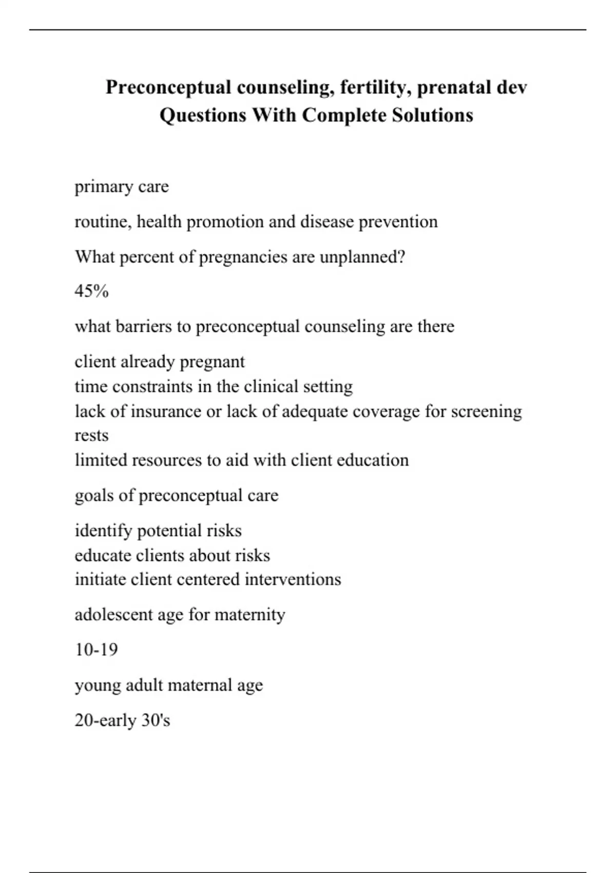 Preconceptual counseling, fertility, prenatal dev Questions With Complete Solutions