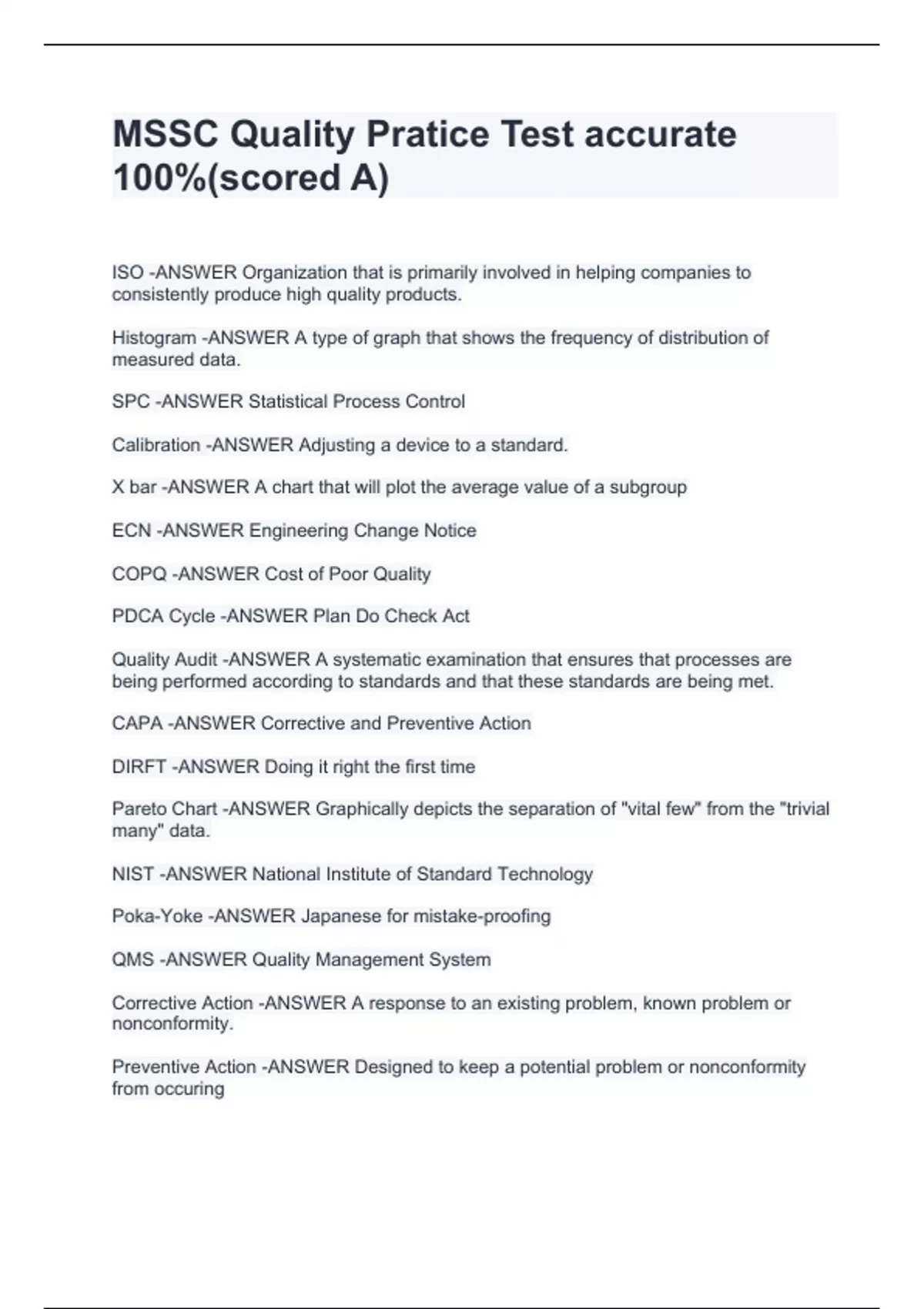 MSSC Quality Pratice Test accurate 100%(scored A) ISO -ANSWER Organization that is primarily involved in helping companies to consistently produce high quality products. Histogram -ANSWER A type of graph that shows the frequency of distribution of measured data. SPC -ANSWER Statistical Process Control Calibration -ANSWER Adjusting a device to a standard. X bar -ANSWER A chart that will plot the average value of a subgroup ECN -ANSWER Engineering Change Notice COPQ -ANSWER Cost of Poor Quality PDCA Cycle -ANSWER Plan Do Check Act Quality Audit -ANSWER A systematic examination that ensures that processes are being performed according to standards and that these standards are being met. CAPA -ANSWER Corrective and Preventive Action DIRFT -ANSWER Doing it right the first time