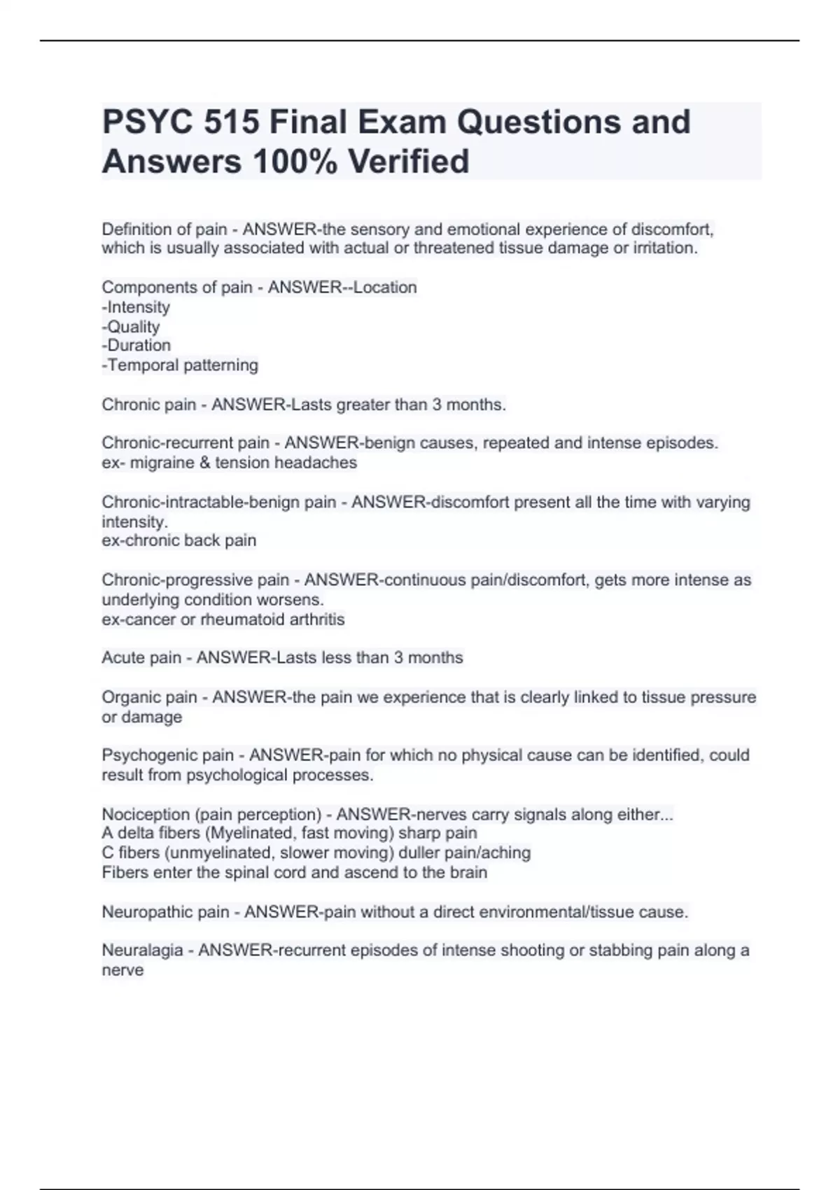 PSYC 515 Final Exam Questions and Answers 100% VerifiedPSYC 515 Final Exam Questions and Answers 100% VerifiedPSYC 515 Final Exam Questions and Answers 100% VerifiedPSYC 515 Final Exam Questions and Answers 100% Verified Definition of pain - ANSWER-the sensory and emotional experience of discomfort, which is usually associated with actual or threatened tissue damage or irritation. Components of pain - ANSWER--Location -Intensity -Quality -Duration -Temporal patterning Chronic pain - ANSWER-Lasts greater than 3 months. Chronic-recurrent pain - ANSWER-benign causes, repeated and intense episodes.