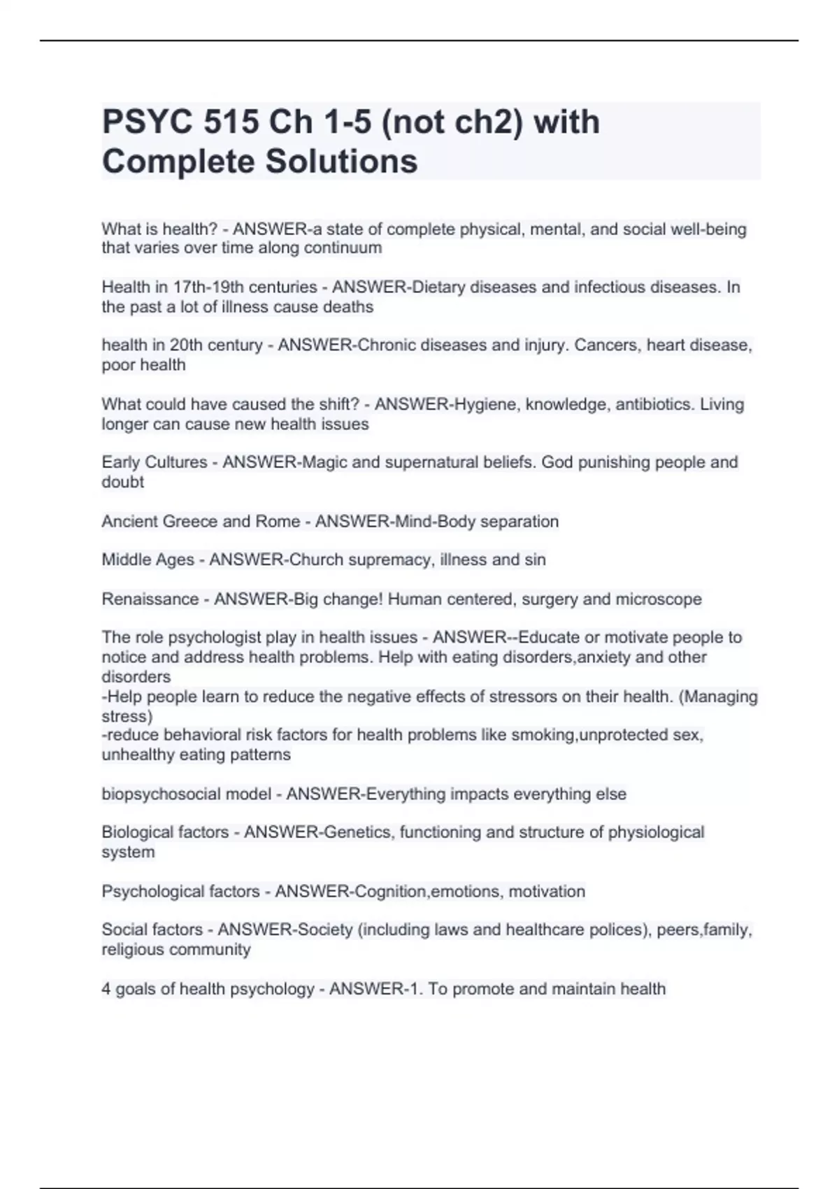 PSYC 515 Ch 1-5 (not ch2) with Complete Solutions PSYC 515 Ch 1-5 (not ch2) with Complete Solutions PSYC 515 Ch 1-5 (not ch2) with Complete Solutions What is health? - ANSWER-a state of complete physical, mental, and social well-being that varies over time along continuum Health in 17th-19th centuries - ANSWER-Dietary diseases and infectious diseases. In the past a lot of illness cause deaths health in 20th century - ANSWER-Chronic diseases and injury. Cancers, heart disease, poor health