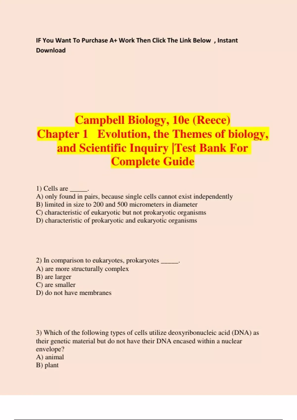 Campbell Biology, 10e (Reece) Chapter 1 Evolution, the Themes of biology, and Scientific Inquiry |Test Bank For Complete Guide