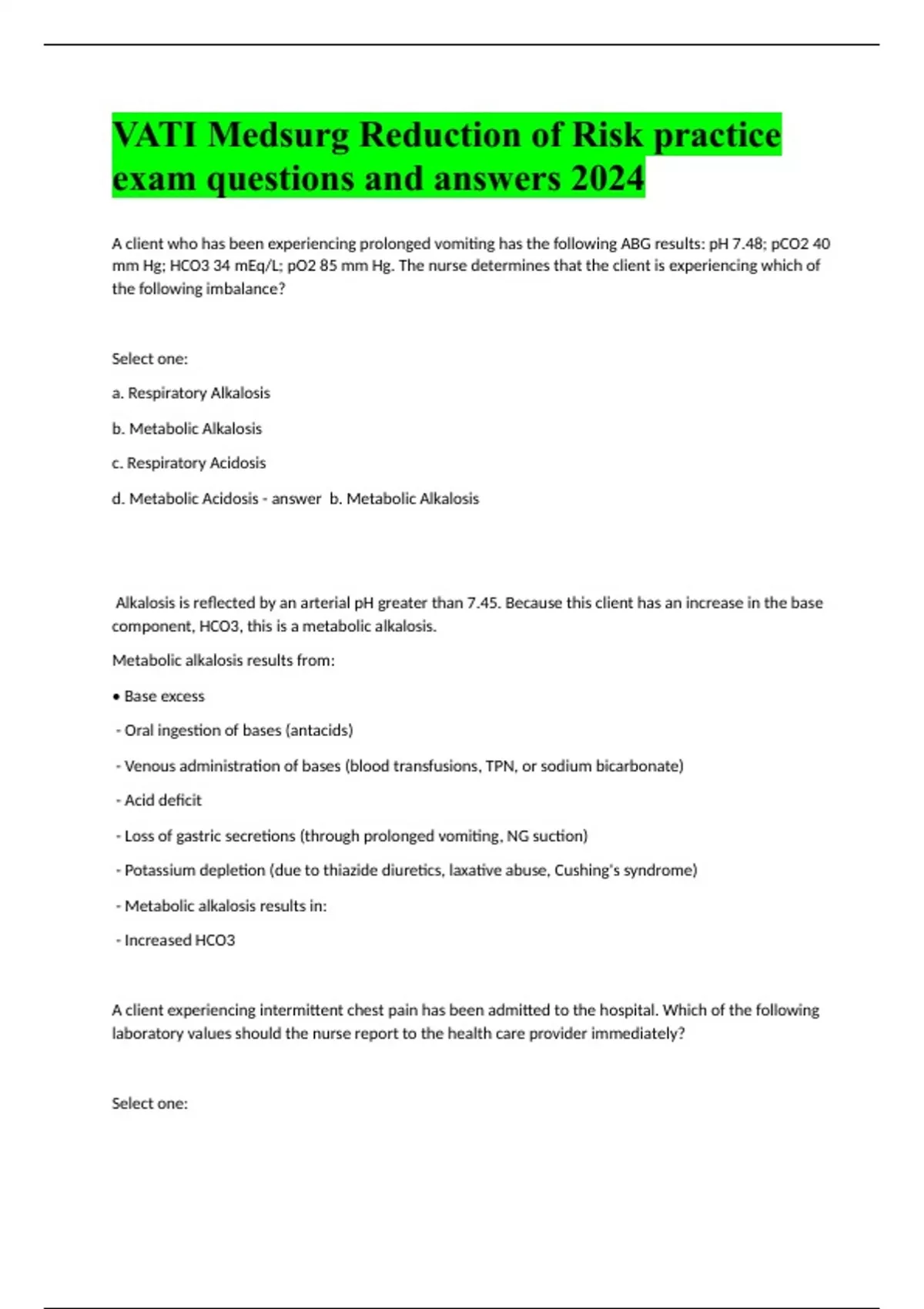 A client who has been experiencing prolonged vomiting has the following ABG results: pH 7.48; pCO2 40 mm Hg; HCO3 34 mEq/L; pO2 85 mm Hg. The nurse determines that the client is experiencing which of the following imbalance? Select one: a. Respiratory Alkalosis b. Metabolic Alkalosis c. Respiratory Acidosis d. Metabolic Acidosis b. Metabolic Alkalosis Alkalosis is reflected by an arterial pH greater than 7.45. Because this client has an increase in the base component, HCO3, this is a metabolic alkalosis. Metabolic alkalosis results from: • Base excess - Oral ingestion of bases (antacids) - Venous administration of bases (blood transfusions, TPN, or sodium bicarbonate) - Acid deficit - Loss of gastric secretions (through prolonged vomiting, NG suction) - Potassium depletion (due to thiazide diuretics, laxative abuse, Cushing's syndrome) - Metabolic alkalosis results in: - Increased HCO3 A client experiencing intermittent chest pain has been admitted to the hospital. Which of the following laboratory values should the nurse report to the health care provider immediately? Select one: a. Creatine kinase (CK) 90 units/L b. C-reactive protein (CRP) 0.2 mg/dL c. Total myoglobin 60 mcg/L d. Cardiac troponin T 1.2 ng/mL d. Cardiac troponin T 1.2 ng/mL A client is having an exercise electrocardiography (stress test) performed. The nurse recognizes the need to stop the test if which of the following occurs? Select one: a. The client begins to breathe harder b. The client experiences an increase in heart rate. c. QRS complexes begin to occur more frequently. d. An ST segment depression or T wave inversion on the EKG. d. An ST segment depression or T wave inversion on the EKG. A client is discharged following a cardiac catheterization procedure. Which of the following should the nurse include in the discharge teaching? Select one: a. Limit activity for several days after the procedure. b. Remove dressing the evening of the procedure. c. Notify provider if bruising is noted at the site. d. Tub baths the night following the procedure are acceptable. a. Limit activity for several days after the procedure. A nurse is caring for a client post aortofemoral bypass surgery. Which of the following interventions would be contraindicated? Select one: a. Encouraging client to sit in high Fowler's position. b. Monitoring client for changes in blood pressure. c. Maintaining NPO status until first postoperative day. d. Coughing and deep breathing every 1 to 2 hours. a. Encouraging client to sit in high Fowler's position. A nurse is caring for a client at risk for atelectasis. Which of the following should the nurse monitor for manifestations of atelectasis? Select one: a. Pulse oximetry b. Daily weight c. Intake and output d. Lung sounds a. Pulse oximetry A client is admitted to the hospital with a diagnosis of Grave's disease. Which of the following findings should be reported to the provider immediately? Select one: a. Hyperactive deep tendon reflexes b. Increase in temperature from 99.5 F to 100.5 F c. Increased number of stools d. Increase in white blood cell count from 6,000 mm3 to 8,000 mm3 b. Increase in temperature from 99.5 F to 100.5 F A nurse is caring for a client with a new onset bowel obstruction. What assessment finding would be anticipated when completing an abdominal assessment? Select one: a. Absent bowel sounds. b. Hyperactive bowel sounds. c. Normal bowel sounds. d. Hypoactive bowel sounds. b. Hyperactive bowel sounds. Reduction of Risk: ARDS A client is recovering from acute respiratory distress syndrome (ARDS). Which clinical manifestation requires immediate attention by the nurse? Select one: a. Increased oxygen saturation b. Increase in pulse rate c. A decrease in blood pressure d. A decrease in temperature c. A decrease in blood pressure A client is receiving chemotherapy for the treatment of breast cancer. Which of the following findings should be reported to the provider immediately? Select one: a. Mucositis b. Alopecia c. Absolute neutrophil count 8,000/mm3 d. Temperature 38.1°C d. Temperature 38.1°C A client is prescribed TPN (total parenteral nutrition) to be infused through a single lumen PICC (peripherally inserted central catheter). Which of the following actions should the nurse take if the client is prescribed intravenous antibiotic therapy? Select one: a. Stop the TPN to administer the antibiotic as ordered. b. Administer the antibiotic through the TPN line. c. Identify alternative methods of administration. d. Request the provider insert a second PICC line. c. Identify alternative methods of administration. A nurse is providing education to a client with coronary artery disease. Which of the following cholesterol values should the nurse identify as a goal for this client? Select one: a. HDL-C level 20 mg/dL b. LDL-C level 120 mg/dL c. HDL-C level 60 mg/dL d. LDL-C level 98 mg/dL c. HDL-C level 60 mg/dL A client is admitted to the inpatient care unit with a diagnosis of diabetic ketoacidosis (DKA). Which of the following laboratory findings should the nurse expect? Select one: a. Serum pH 7.40 b. Serum glucose 200 mg/dL c. Low serum osmolality d. Urine ketones positive d. Urine ketones positive Physiological Integrity: COPD, Oxygen Therapy A client diagnosed with chronic obstructive pulmonary disease (COPD) is reporting shortness of breath upon exertion. The client is prescribed oxygen at 3 L/min and his oxygen saturation level is measuring 86%. The nurse understands which of the following is the priority intervention? Select one: a. Teach the client to eat several small meals a day. b. Encourage the client to stop smoking. c. Increase oxygen from 3L/min to 6 L/min. d. Position the client in the high-Fowlers. d. Position the client in the high-Fowlers. A nurse is caring for a client who underwent a right below the knee amputation yesterday. Which of the following findings should the nurse report to the provider immediately? Select one: a. Quarter size spot of blood on dressin