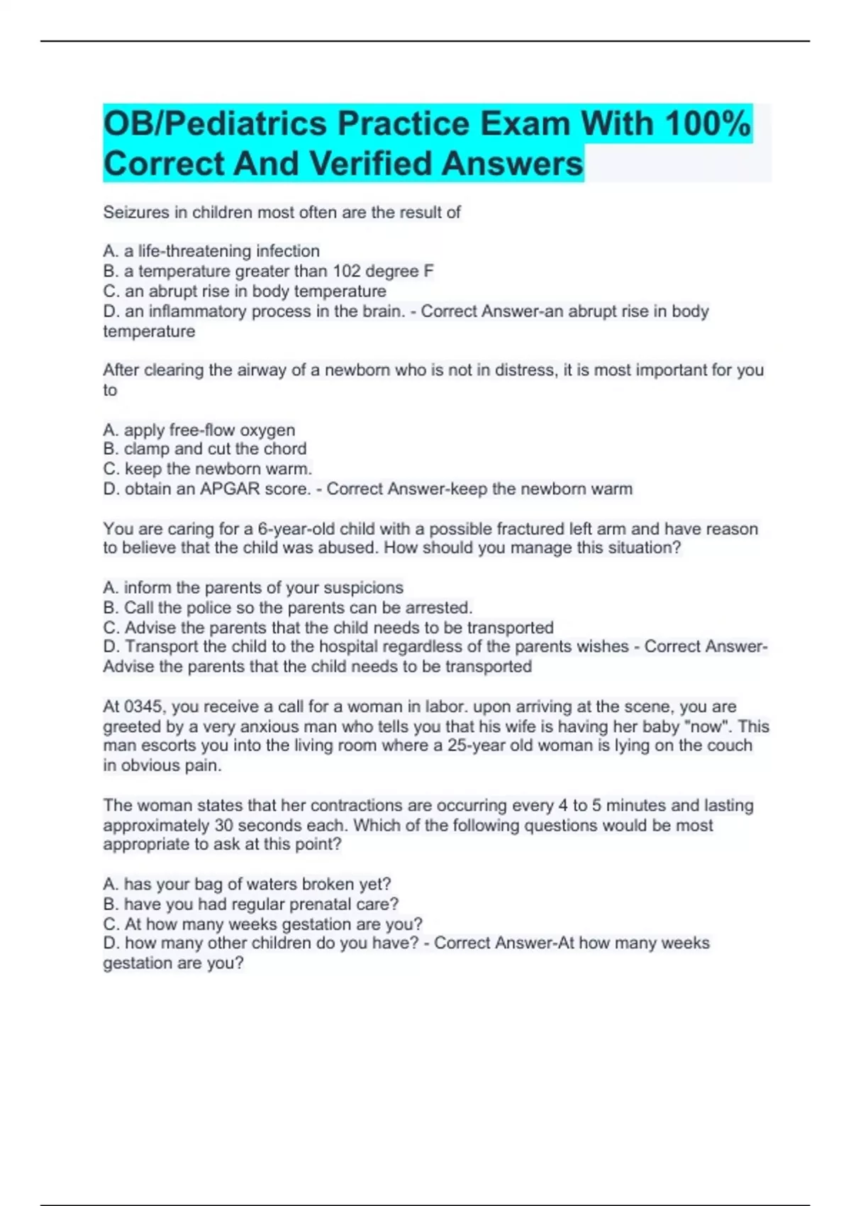 OB/Pediatrics Practice Exam With 100% Correct And Verified Answers