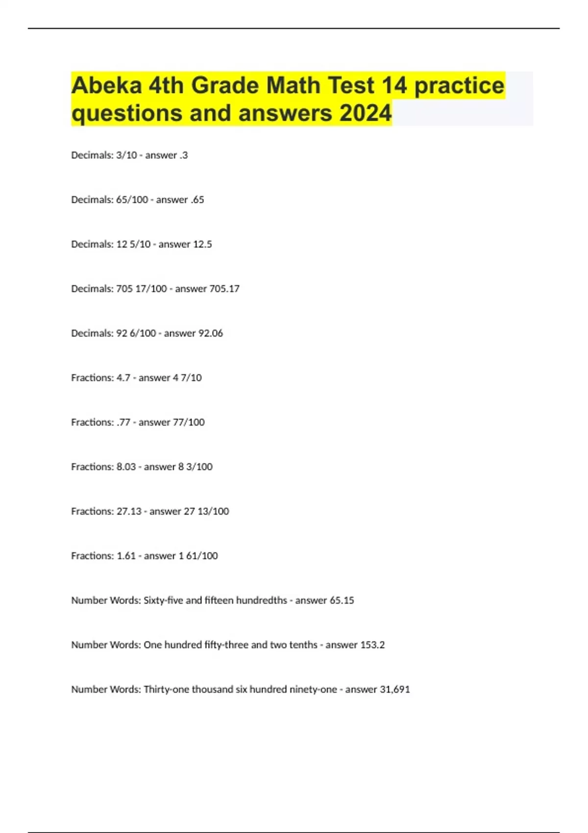 Abeka 4th Grade Math Test 14 practice questions and answers 2024.
