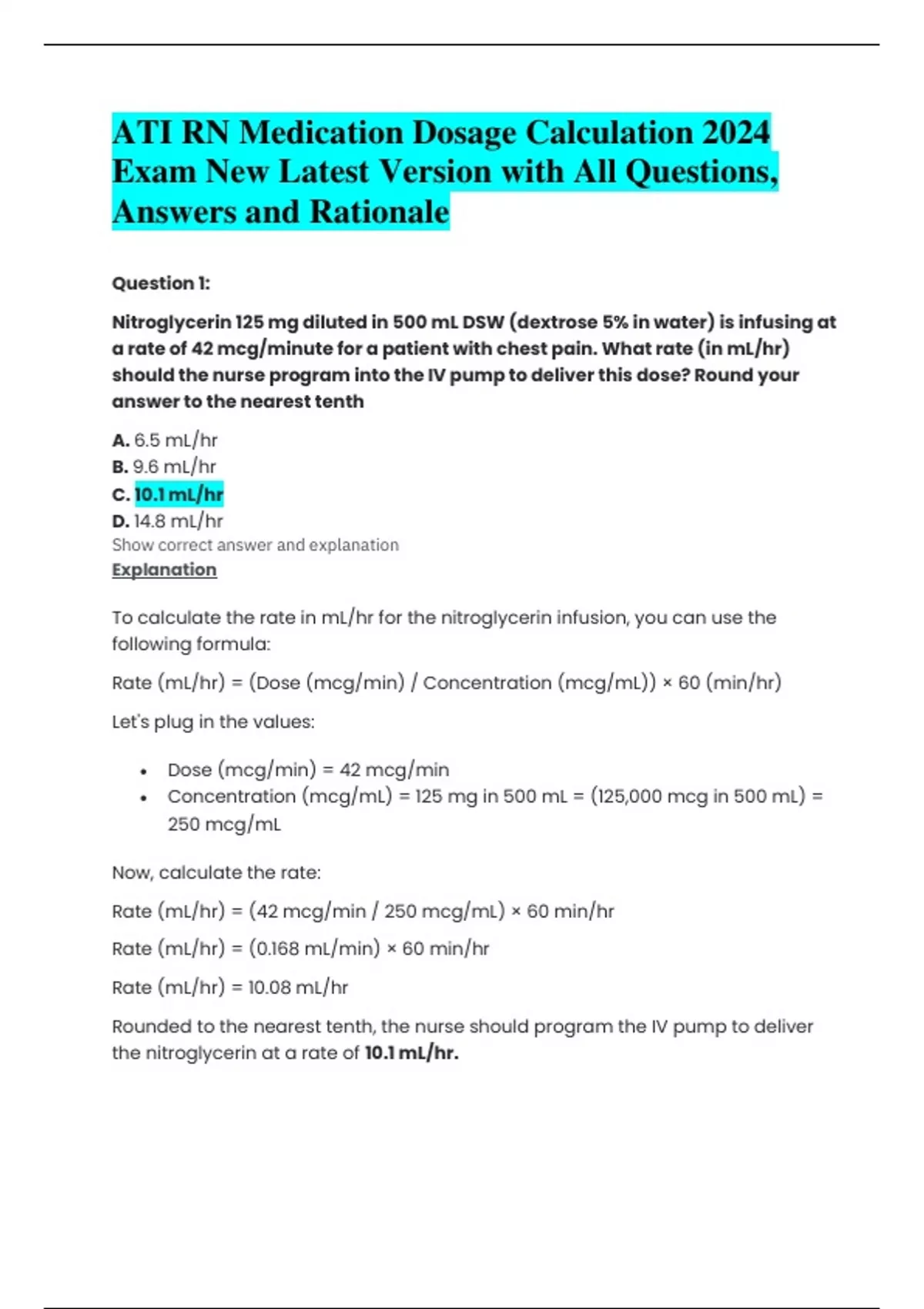 ATI RN Medication Dosage Calculation 2024 Exam New Latest Version with All Questions, Answers and Rationale