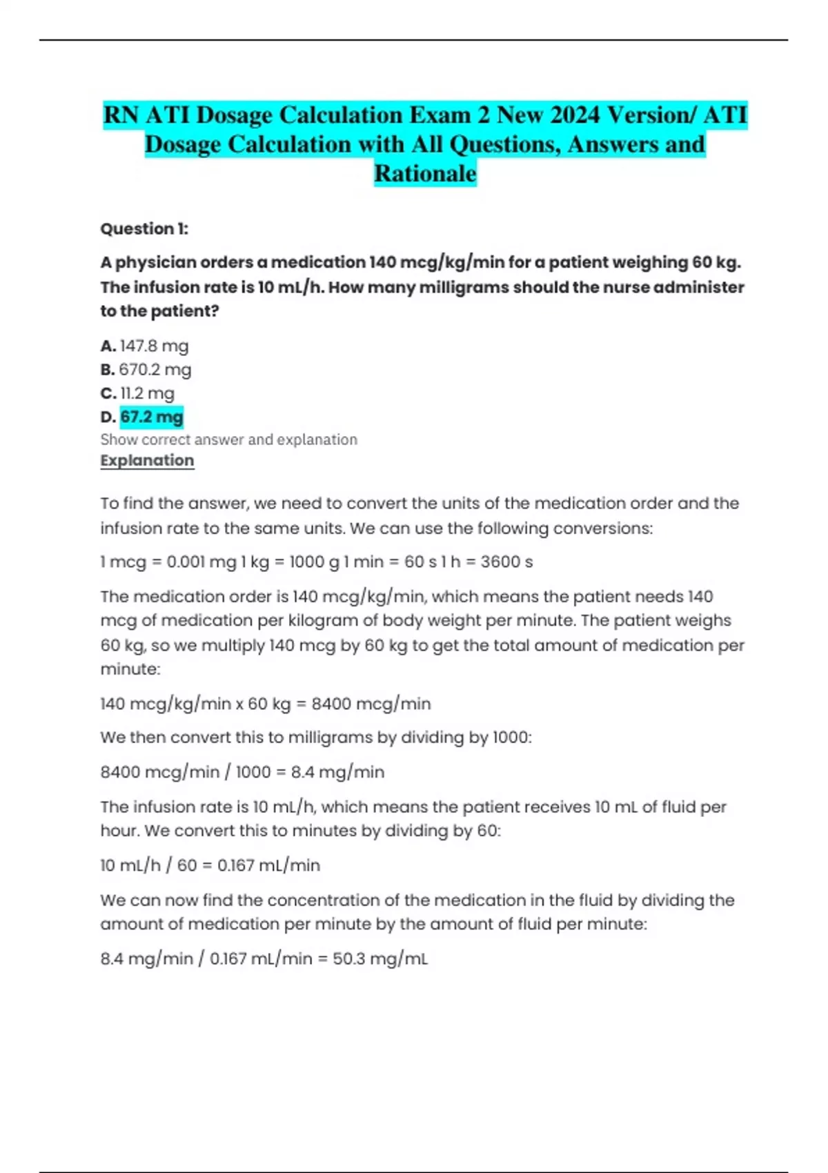RN ATI Dosage Calculation Exam 2 New 2024 Version/ ATI Dosage Calculation with All Questions, Answers and Rationale