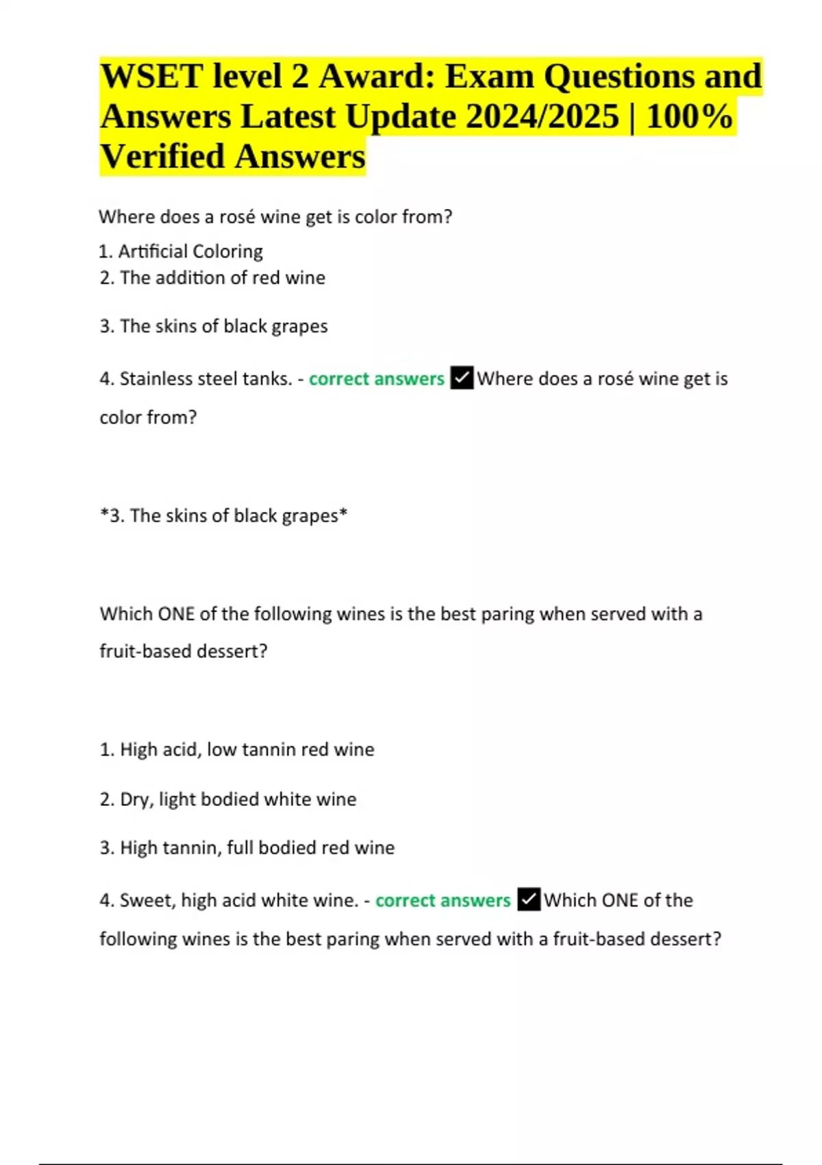 WSET level 2 Award: Exam Questions and Answers Latest 2024/2025 | 100% Verified Answers. Where does a rosé wine get is color from? 1. Artificial Coloring 2. The addition of red wine 3. The skins of black grapes 4. Stainless steel tanks. - correct answers Where does a rosé wine get is color from? *3. The skins of black grapes* Which ONE of the following wines is the best paring when served with a fruit-based dessert? 1. High acid, low tannin red wine 2. Dry, light bodied white wine 3. High tannin, full bodied red wine 4. Sweet, high acid white wine. - correct answers Which ONE of the following wines is the best paring when served with a fruit-based dessert? WSET level 2 Award: Exam Questions and Answers Latest Update 2024/2025 | 100% Verified Answers *4. Sweet, high acid white wine.* In which country is Chianti DOCG Produced? - correct answers In which country is Chianti DOCG Produced? *Italy* Which grape variety is used to make AC Côte-Rôtie? 1. Riesling 2. Pinot Noir 3. Sémillon 4. Syrah - correct answers Which grape variety is used to make AC CôteRôtie? *2. Pinot Noir* Which spirit uses the term London Dry? - correct answers Which spirit uses the term London Dry? *Gin* What style of wine is Rutherglen Muscat? 1. Dry Fortified White 2. Sweet Fortified White 3. Dry Fortified Red 4. Sweet Fortified Red - correct answers What style of wine is Rutherglen Muscat? *2. Sweet Fortified White* In which country is the county of Sonoma? - correct answers In which country is the county of Sonoma? *USA* Which gas is given off during alcoholic fermentation? - correct answers Which gas is given off during alcoholic fermentation? *Carbon Dioxide* Which ONE of the following is the most important grape variety in Argentina? 1. Gewurstraminer 2. Nebbiolo 3. Malbec 4. Grenache - correct answers Which ONE of the following is the most important grape variety in Argentina? *3. Malbec* Which ONE of the following pairs is CORRECTLY matched? 1. Vouvray and Italy 2. Beaujolais and Bordeaux 3. Meursault and Portugal 4. Tempranillo and Rioja - correct answers Which ONE of the following pairs is CORRECTLY matched? *4. Tempranillo and Rioja* Which one of the following conditions would NOT be ideal when assessing a wine? 1. Good natural daylight 2. No distracting smells 3. Dark wooden surfaces and walls 4. A clean ISO tasting glass - correct answers Which one of the following conditions would NOT be ideal when assessing a wine? *3. Dark wooden surfaces and walls* Which one of the following grape varieties is used in Alsace to make unoaked white wines that are high in acidity? 1. Riesling 2. Chardonnay 3. Merlot 4. Gamay - correct answers Which one of the following grape varieties is used in Alsace to make unoaked white wines that are high in acidity? *1. Riesling* Which ONE of the following is a varietally labelled wine? 1. Gevery-Chambertin 2. Pouilly-Fuissé 3. Marlborough Sauvignon Blanc 4. Saint-Emilion - correct answers Which ONE of the following is a varietally labelled wine? *3. Marlborough Sauvignon Blanc* In which country is the region of Maipo? 1. USA 2. Australia 3. Chile 4. Argentina - correct answers In which country is the region of Maipo? *3. Chile* What style of wine is Sekt? 1. Dry, still wine 2. Sweet, still wine 3. Sparkling wine 4. Fortified wine - correct answers What style of wine is Sekt? *3. Sparkling wine*