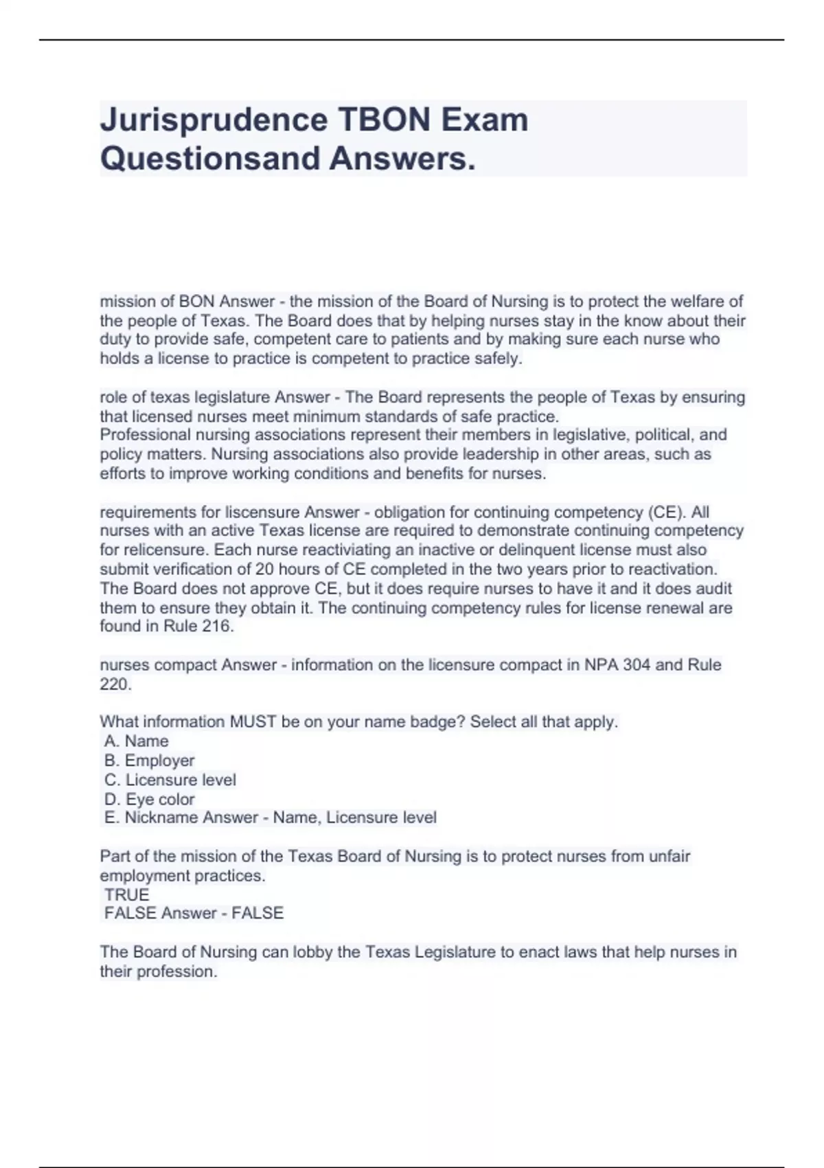 Texas Nursing Jurisprudence Exam Bundle.