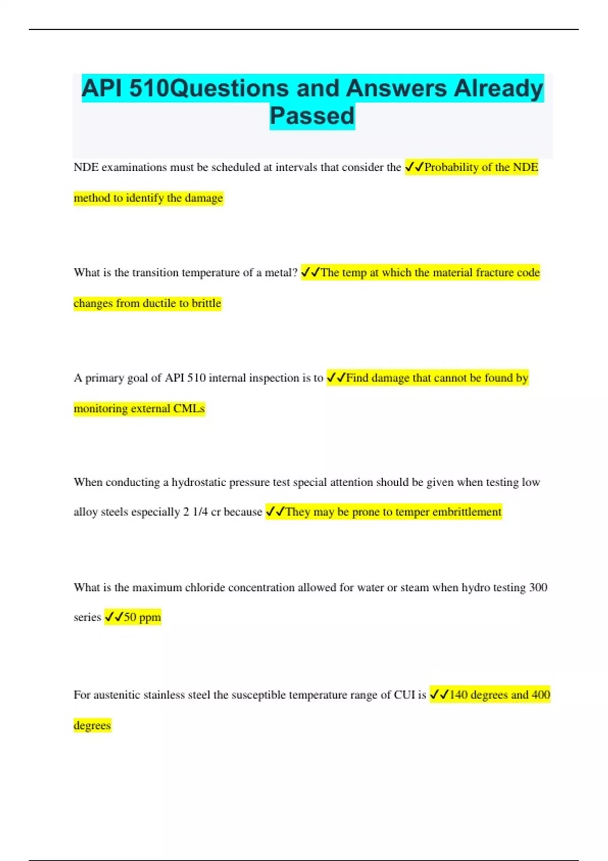 API 510Questions and Answers Already Passed NDE examinations must be scheduled at intervals that consider the Probability of the NDE method to identify the damage What is the transition temperature of a metal? The temp at which the material fracture code changes from ductile to brittle A primary goal of API 510 internal inspection is to Find damage that cannot be found by monitoring external CMLs When conducting a hydrostatic pressure test special attention should be given when testing low alloy steels especially 2 1/4 cr because They may be prone to temper embrittlement What is the maximum chloride concentration allowed for water or steam when hydro testing 300 series 50 ppm For austenitic stainless steel the susceptible temperature range of CUI is 140 degrees and 400 degrees How many systems and procedures must be documented and implemented per API 510 in a owner user inspection repair management system for pressure vessels and pressure relief devices 19 The consequence of a release is dependent on The type and amount of process fluid contained in the equipment The surface at a weld with a joint factor the 1.0 is corroded. The calculation to determine if the thickness at the corroded are governs the allowable working pressure should be The thickness of the surface of the weld includes 1" or twice the minimum thickness on either side of the weld whichever is greater A methodology whereby flaws and conditions contained within an equipment item are assessed in order to determine the integrity of the equipment for continued service is referred to as Fitness for service evaluation What is a pressure vessel engineer responsible for Activities involving design engineering review analysis or evaluation of vessels When can pressure tests of vessel components be performed in lieu of entire vessel testing After consultations with an engineer An inspection plan shall be developed for All pressure vessels and pressure relieving devices Which of the following techniques is specifically cited by API 577 as having special limitations due to concerns for incomplete fusion GMAW -Spray transfer According to API 510 on stream inspections should be conducted by whom An inspector or examiner All tools equipment and personal protective equipment used during vessel work Should be check prior to work Welding inspection occurs Prior to, during, and after welding During welding operations the inspector should
