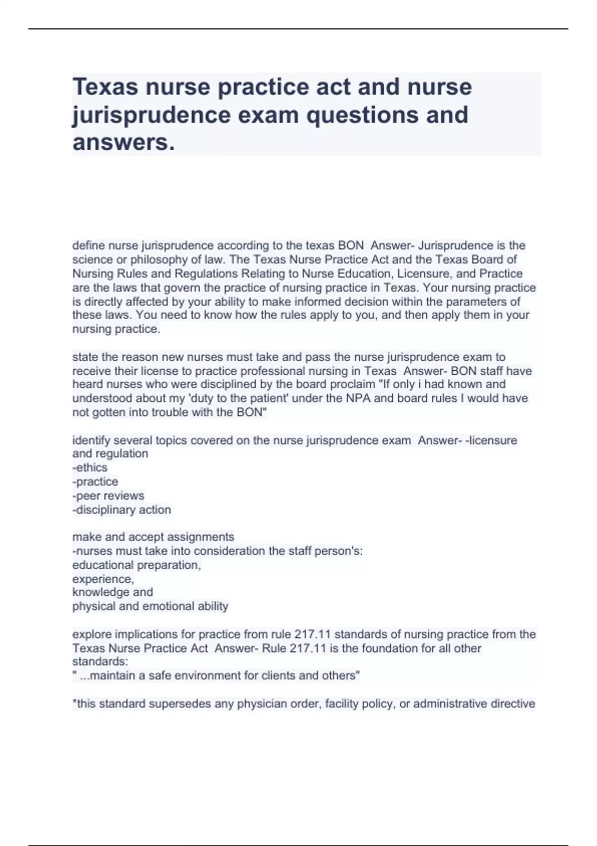 Texas nurse practice act and nurse jurisprudence exam questions and answers
