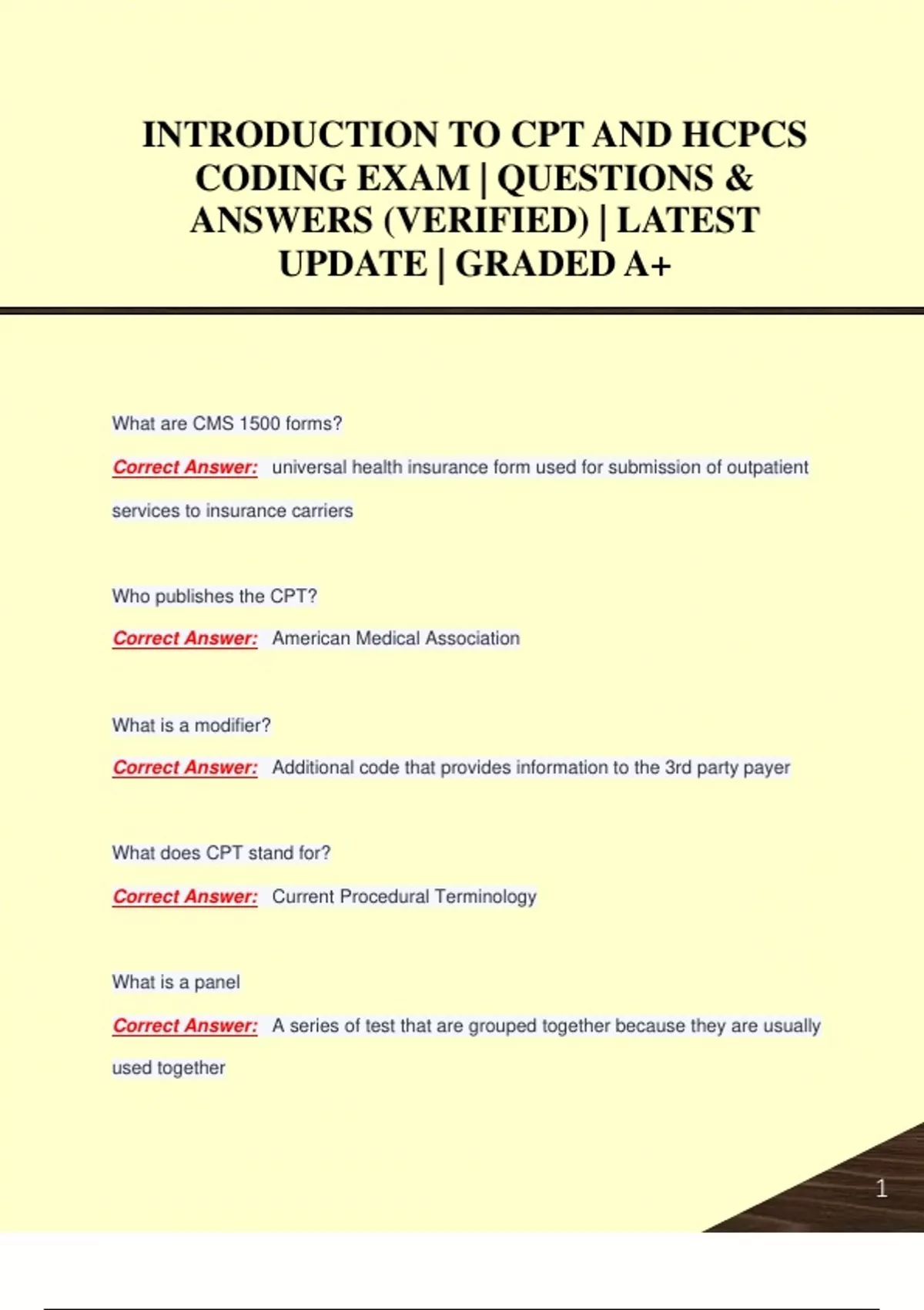 INTRODUCTION TO CPT AND HCPCS CODING EXAM | QUESTIONS & ANSWERS (VERIFIED) | LATEST UPDATE | GRADED A+ What are CMS 1500 forms? Correct Answer: universal health insurance form used for submission of outpatient services to insurance carriers Who publishes the CPT? Correct Answer: American Medical Association What is a modifier? Correct Answer: Additional code that provides information to the 3rd party payer What does CPT stand for? Correct Answer: Current Procedural Terminology What is a panel Correct Answer: A series of test that are grouped together because they are usually used together 2 What is a block? Correct Answer: Frozen piece of a sample What is a section? Correct Answer: Slice of frozen block Who is the one who requires a special report when you use unlisted codes? Correct Answer: The company, insurance company, or 3rd party payer that is processing the claims. Which code does the pathology section include test only? Correct Answer: Laboratory Test Only What are the descriptive components for the emergency departments? Correct Answer: Time is not the descriptive component in the emergency department What does Appendix B cover? Correct Answer: Additions to, deletion from and revisions What are J codes? Correct Answer: Drug