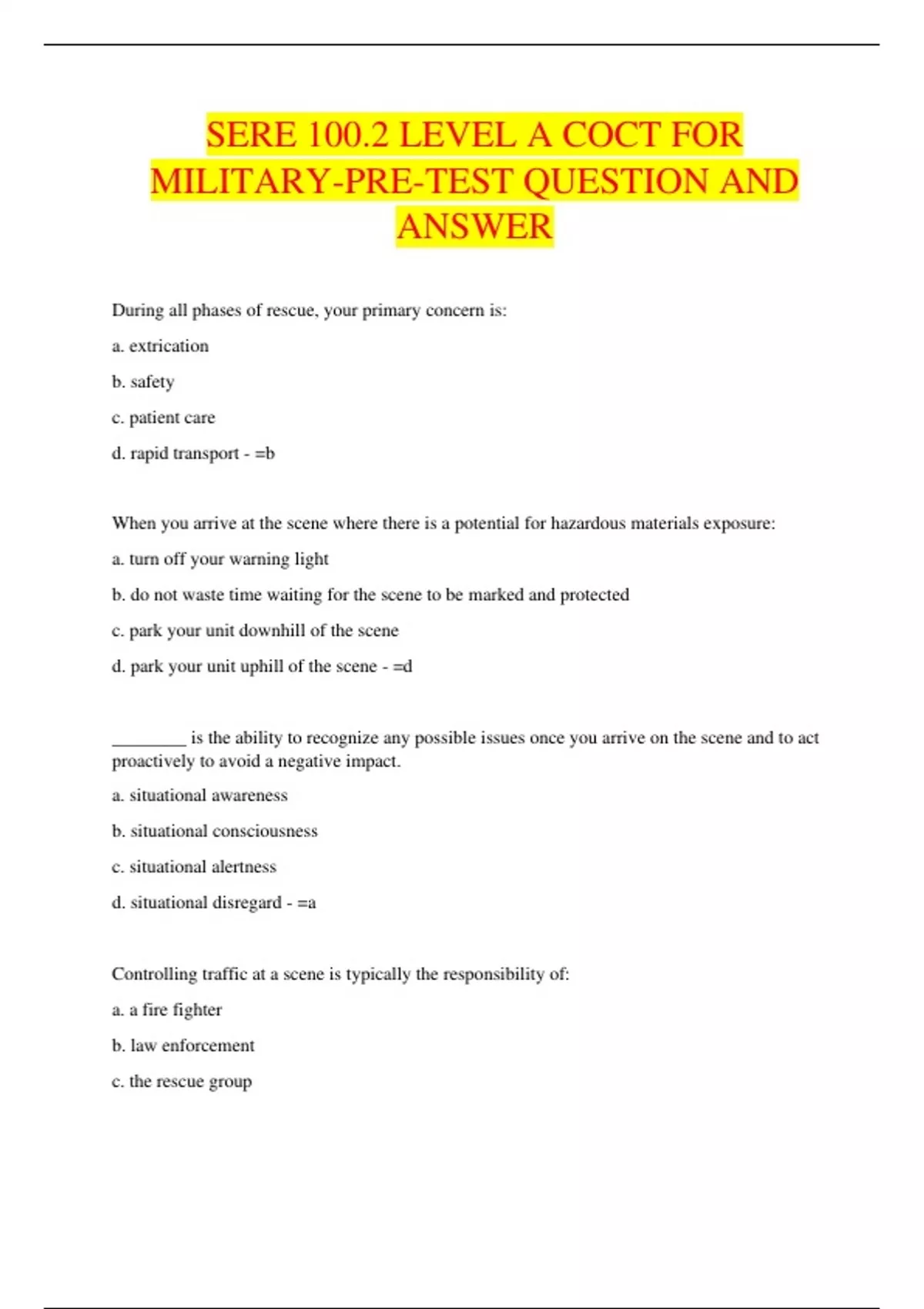 SERE 100.2 LEVEL A COCT FOR MILITARY-PRE-TEST QUESTION AND ANSWER
