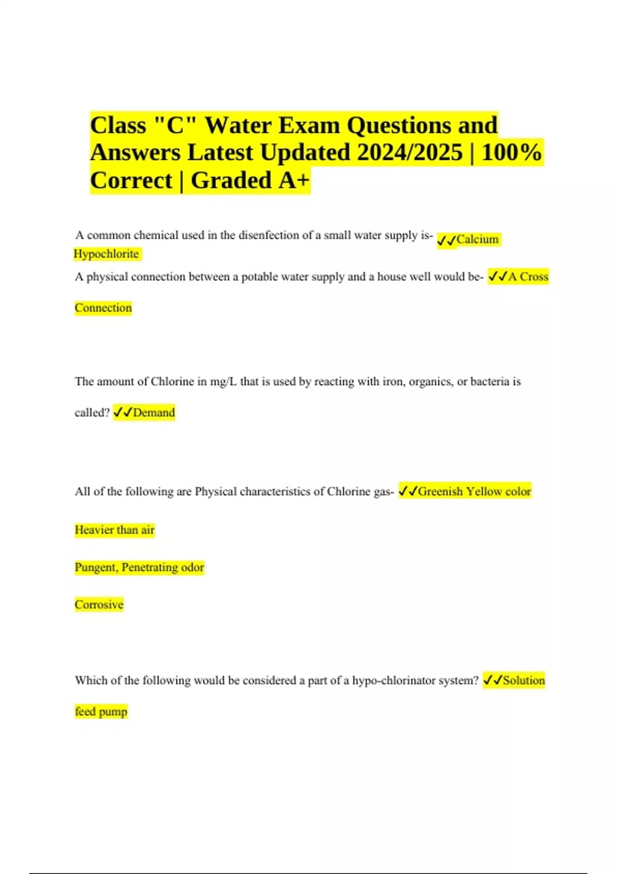 Class C Water Operator Exam Questions and Answers Latest Updated 2024/2025 | 100% Correct (Graded A+) A common chemical used in the disenfection of a small water supply is- Calcium Hypochlorite A physical connection between a potable water supply and a house well would be- A Cross Connection The amount of Chlorine in mg/L that is used by reacting with iron, organics, or bacteria is called? Demand All of the following are Physical characteristics of Chlorine gas- Greenish Yellow color Heavier than air Pungent, Penetrating odor Corrosive Which of the following would be considered a part of a hypo-chlorinator system? Solution feed pump Class "C" Water Exam Questions and Answers Latest Updated 2024/2025 | 100% Correct | Graded A+ According to state requirements, all public water supply wells should be provided with a raised concrete sealing block, screened vents and- Flow measuring device The drawdown of a water well is determined by- The difference in static and pumping levels The pH of water indicates- If it is more acidic or base The pH of water is expressed by a scale of numbers ranging from- 0-14 Water that is considered neutral is expressed on the pH scale at- 7.0 Which of the following is a required step in collecting a routine distribution sample for bacteriological testing? Use of an approved, sterile container Sand filtration will remove which of the following from surface water? Turbidity Activated Carbon is used in a Surface Water Plant primarily for? Taste and Odor control Which of the following chemical(s) are commonly used as coagulants in surface water treatment? Alum and Ferric Chloride Ground storage tanks are required to be provided with which of the following? Screened Vents An approved locking roof hatch An overflow pipe with hinged flap device Annual inspection and maintenance as needed An elevated storage tank should be protected against corrosion by- Painting Cathodic protection Water stabilization A public water supply system should maintain residual pressure of 20 psi and a minimum normal operating pressure of- 35 psi Before a new or repaired water line is placed into service, it must be properly disinfected by providing a chlorine dosage of _____ and proper detention time. 50 mg/L Water bearing formations beneath the earth's surface that are used as a source of water for public water supplies are- Aquifers The purpose of an air line on a well is- Determine water levels in the well The mesh size is an important feature of a well screen because property sized openings should- Reduce the amount of sand pumped When treating surface water, the process of coagulation will be most affected by the- pH, alkalinity, temperature, and chemical dosage A rapid sand filter should be backwashed when- When the loss of head gauge indicated between 6 and 10 ft. Which of the following is an acceptable disinfection residual at the far reaches of the distribution system- 0.2 mg/L free chlorine residual 0.5 mg/L chloramine residual for a surface water supply 0.8 mg/L chloramine residual when using chloramine treatment 0.5 mg/L free chlorine residual for a groundwater supply One gallon of water weighs- 8.34 lbs One foot of water inside a storage vessel will raise a pressure gauge at the bottom of the vessel by- .433 lbs A raw water intake structure may not be constructed within _____ feet of a boat ramp, dock, or marina 1000 ft Common Type(s) of pump(s) for use in water wells are- Vertical Turbine Submersible _____ is the natural exchange of water between the earth and air. Hydrological Cycle If and when a health hazard contamination event occurs in a public water system, the operator must contact the state regulatory authority within ___ hours by telephone. 24 hours Potable water is that of- Maintained at adequate pressure Pathogen free Contains a chlorine residual Excessive nitrates in drinking water can cause a condition that affects infants under the age of 6 months. This condition is known as- Blue babies