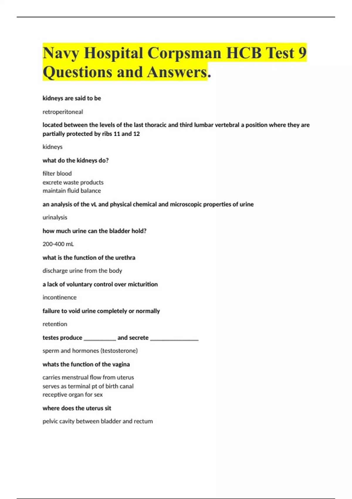 Navy Hospital Corpsman HCB Test 9 Questions and Answers.