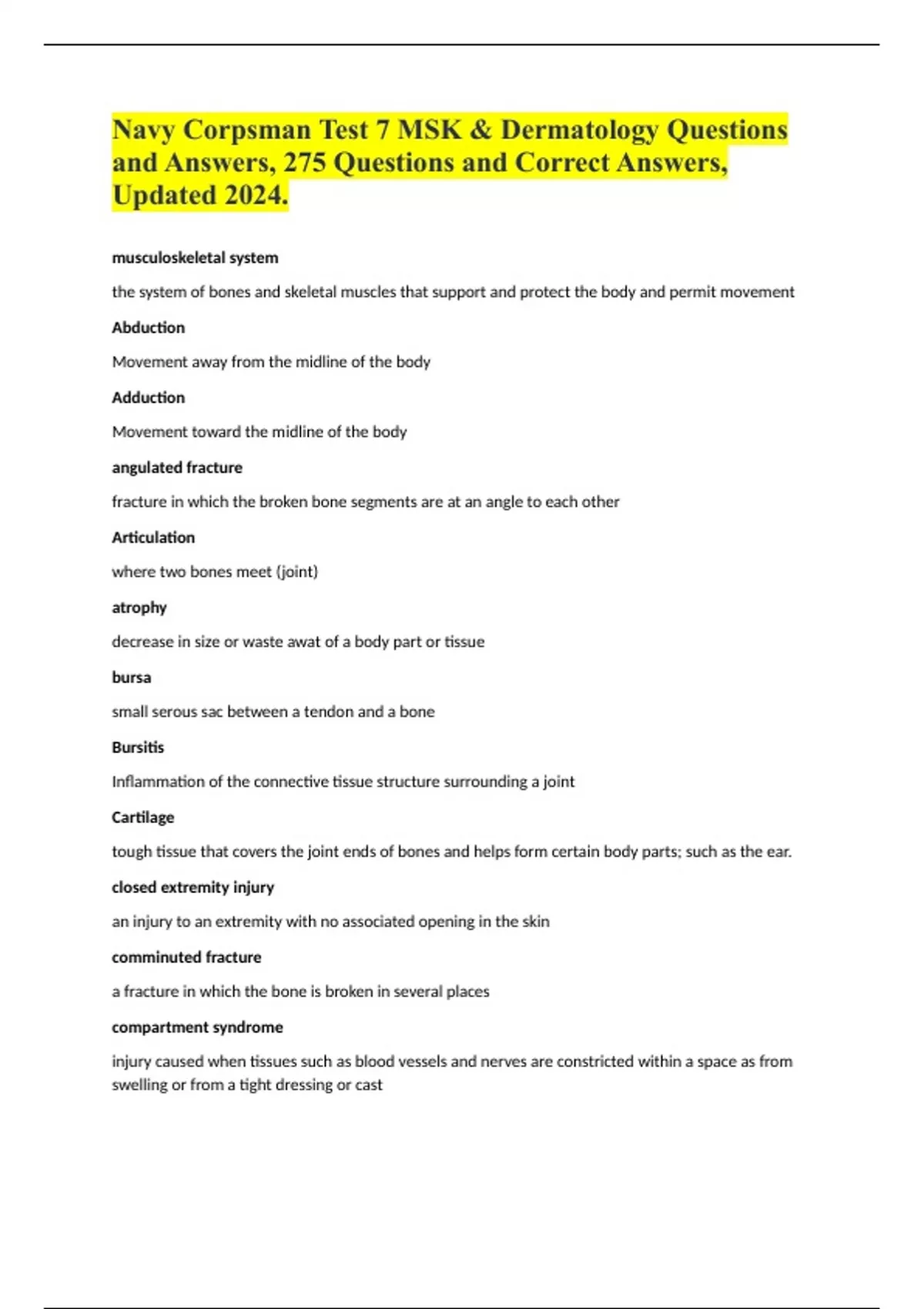 Navy Corpsman Test 7 MSK & Dermatology Questions and Answers, 275 Questions and Correct Answers, Updated 2024. musculoskeletal system the system of bones and skeletal muscles that support and protect the body and permit movement Abduction Movement away from the midline of the body Adduction Movement toward the midline of the body angulated fracture fracture in which the broken bone segments are at an angle to each other Articulation where two bones meet (joint) atrophy decrease in size or waste awat of a body part or tissue bursa small serous sac between a tendon and a bone Bursitis Inflammation of the connective tissue structure surrounding a joint Cartilage tough tissue that covers the joint ends of bones and helps form certain body parts; such as the ear. closed extremity injury an injury to an extremity with no associated opening in the skin comminuted fracture a fracture in which the bone is broken in several places compartment syndrome injury caused when tissues such as blood vessels and nerves are constricted within a space as from swelling or from a tight dressing or cast