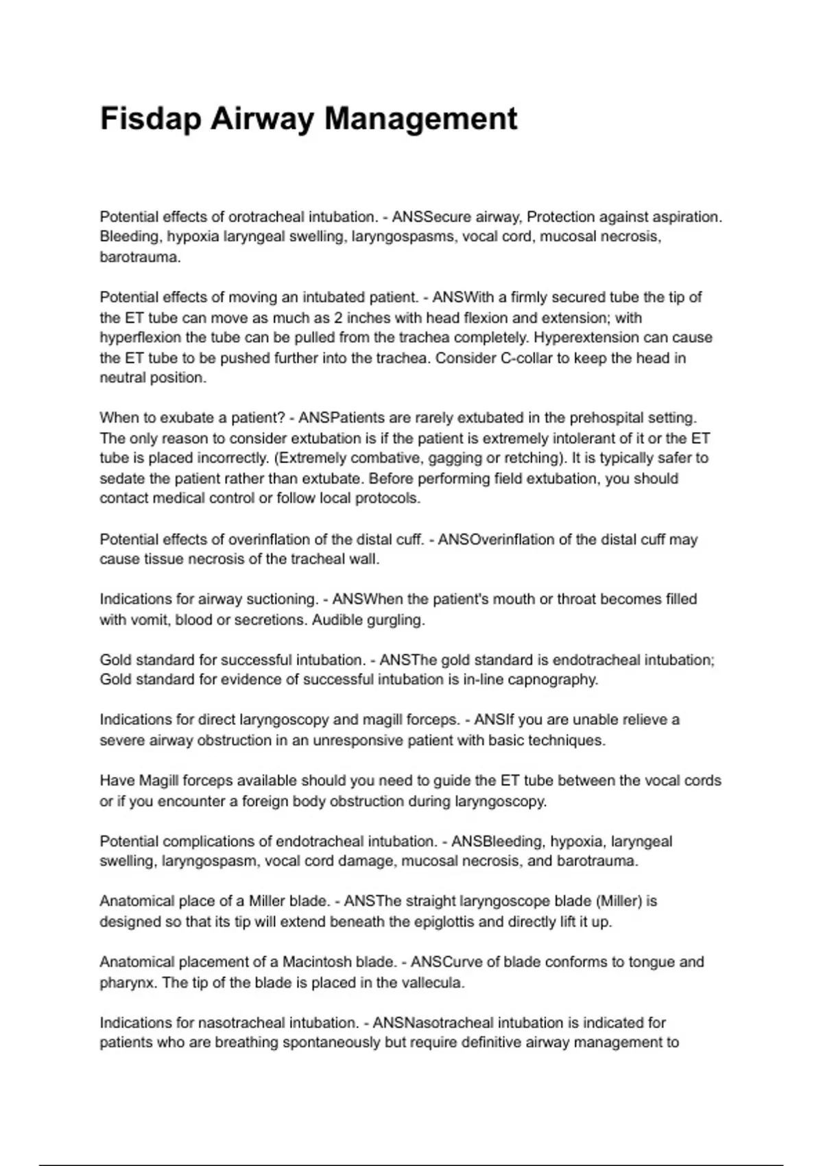 Fisdap Airway Management 2024/2025 A+ score assured
