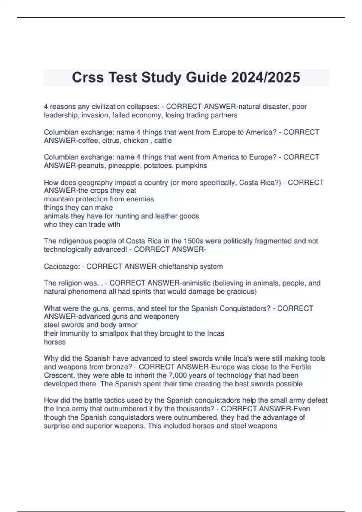 Crss Test Study Guide 2024/2025 4 reasons any civilization collapses: - CORRECT ANSWER-natural disaster, poor leadership, invasion, failed economy, losing trading partners Columbian exchange: name 4 things that went from Europe to America? - CORRECT ANSWER-coffee, citrus, chicken , cattle Columbian exchange: name 4 things that went from America to Europe? - CORRECT ANSWER-peanuts, pineapple, potatoes, pumpkins How does geography impact a country (or more specifically, Costa Rica?) - CORRECT ANSWER-the crops they eat mountain protection from enemies things they can make animals they have for hunting and leather goods who they can trade with The ndigenous people of Costa Rica in the 1500s were politically fragmented and not technologically advanced! - CORRECT ANSWERCacicazgo: - CORRECT ANSWER-chieftanship system The religion was... - CORRECT ANSWER-animistic (believing in animals, people, and natural phenomena all had spirits that would damage be gracious) What were the guns, germs, and steel for the Spanish Conquistadors? - CORRECT ANSWER-advanced guns and weaponery steel swords and body armor their immunity to smallpox that they brought to the Incas horses Why did the Spanish have advanced to steel swords while Inca's were still making tools and weapons from bronze? - CORRECT ANSWER-Europe was close to the Fertile Crescent, they were able to inherit the 7,000 years of technology that had been developed there. The Spanish spent their time creating the best swords possible How did the battle tactics used by the Spanish conquistadors help the small army defeat the Inca army that outnumbered it by the thousands? - CORRECT ANSWER-Even though the Spanish conquistadors were outnumbered, they had the advantage of surprise and superior weapons. This included horses and steel weapons