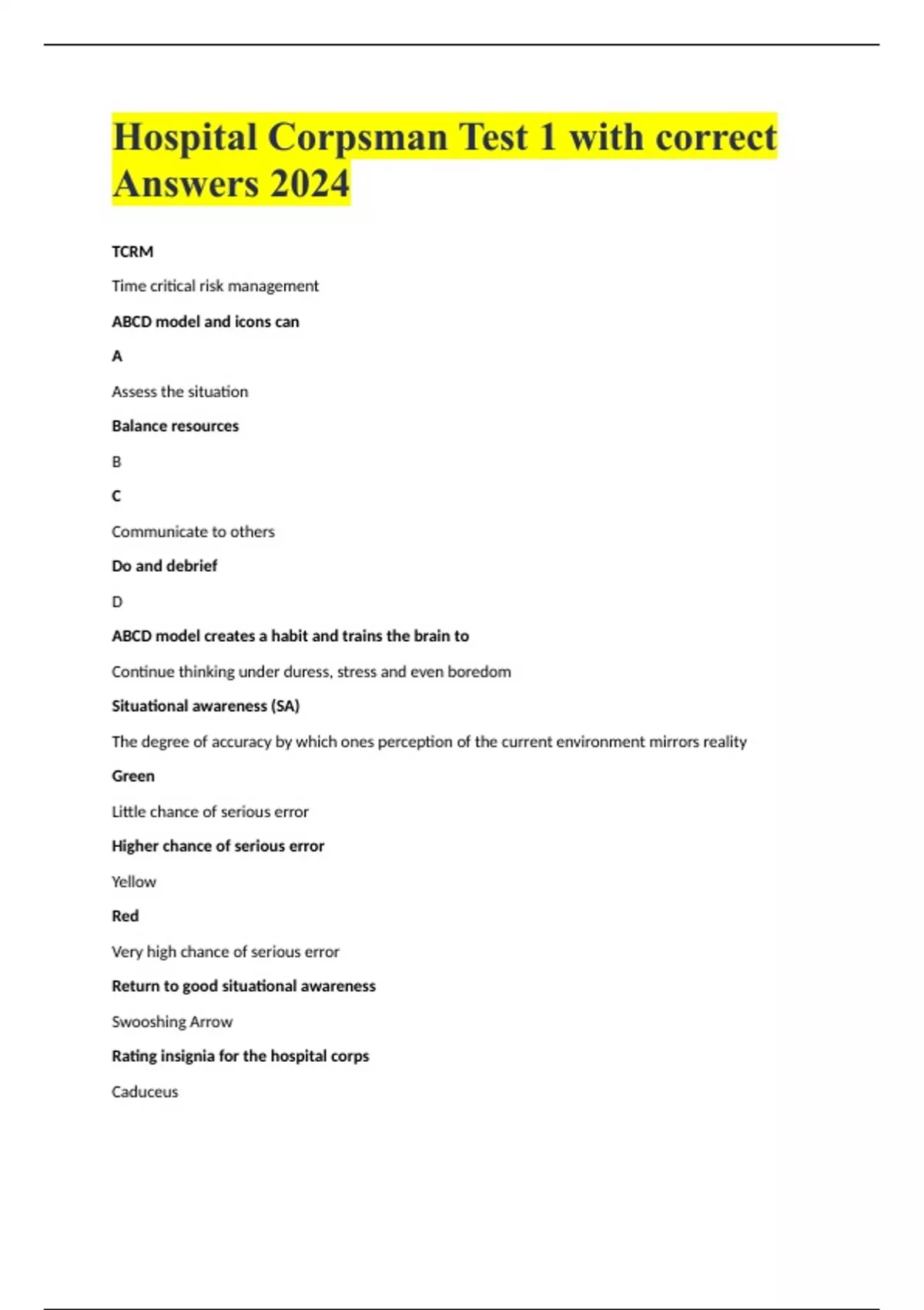 Hospital Corpsman Test 1 with correct Answers 2024 TCRM Time critical risk management ABCD model and icons can A Assess the situation Balance resources B C Communicate to others Do and debrief D ABCD model creates a habit and trains the brain to Continue thinking under duress, stress and even boredom Situational awareness (SA) The degree of accuracy by which ones perception of the current environment mirrors reality Green Little chance of serious error Higher chance of serious error Yellow Red Very high chance of serious error Return to good situational awareness Swooshing Arrow Rating insignia for the hospital corps Caduceus Where sick and injured