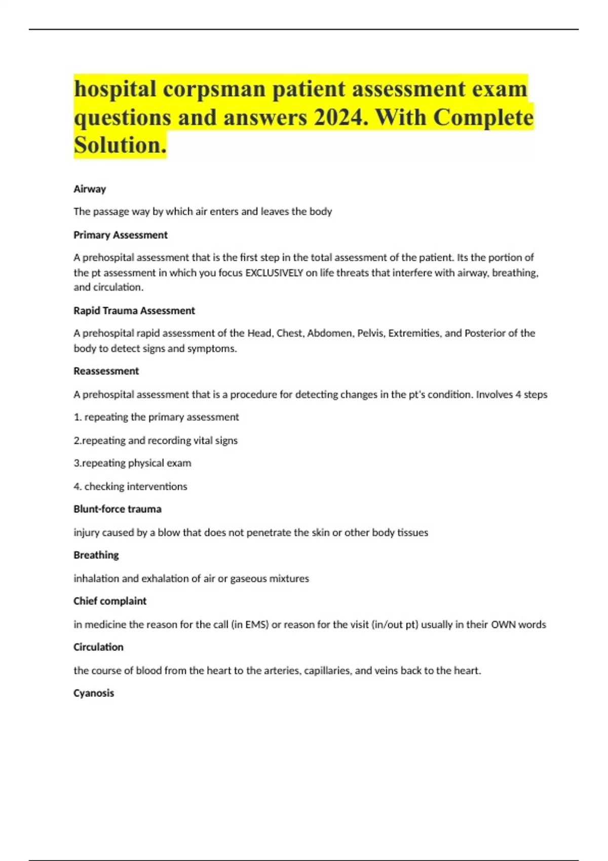 hospital corpsman patient assessment exam questions and answers 2024. With Complete Solution. Airway The passage way by which air enters and leaves the body Primary Assessment A prehospital assessment that is the first step in the total assessment of the patient. Its the portion of the pt assessment in which you focus EXCLUSIVELY on life threats that interfere with airway, breathing, and circulation. Rapid Trauma Assessment A prehospital rapid assessment of the Head, Chest, Abdomen, Pelvis, Extremities, and Posterior of the body to detect signs and symptoms. Reassessment A prehospital assessment that is a procedure for detecting changes in the pt's condition. Involves 4 steps 1. repeating the primary assessment ting and recording vital signs ting physical exam 4. checking interventions Blunt-force trauma injury caused by a blow that does not penetrate the skin or other body tissues Breathing inhalation and exhalation of air or gaseous mixtures Chief complaint in medicine the reason for the call (in EMS) or reason for the visit (in/out pt) usually in their OWN words Circulation the course of blood from the heart to the arteries, capillaries, and veins back to the heart. Cyanosis