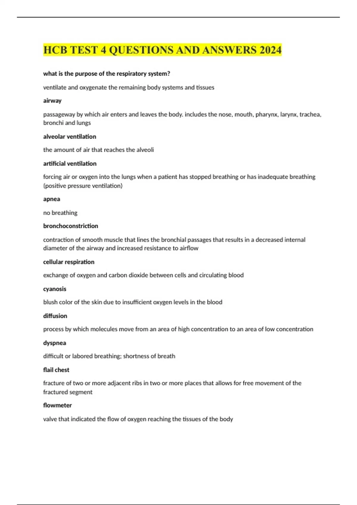 HCB TEST 4 QUESTIONS AND ANSWERS 2024 what is the purpose of the respiratory system? ventilate and oxygenate the remaining body systems and tissues airway passageway by which air enters and leaves the body. includes the nose, mouth, pharynx, larynx, trachea, bronchi and lungs alveolar ventilation the amount of air that reaches the alveoli artificial ventilation forcing air or oxygen into the lungs when a patient has stopped breathing or has inadequate breathing (positive pressure ventilation) apnea no breathing bronchoconstriction contraction of smooth muscle that lines the bronchial passages that results in a decreased internal diameter of the airway and increased resistance to airflow cellular respiration exchange of oxygen and carbon dioxide between cells and circulating blood cyanosis blush color of the skin due to insufficient oxygen levels in the blood diffusion process by which molecules move from an area of high concentration to an area of low concentration dyspnea difficult or labored breathing; shortness of breath flail chest fracture of two or more adjacent ribs in two or more places that allows for free movement of the fractured segment flowmeter valve that indicated the flow of oxygen reaching the tissues of the body