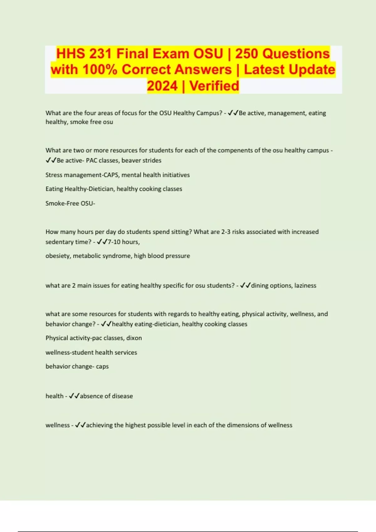 HHS 231 Final Exam OSU | 250 Questions with 100% Correct Answers | Latest Update 2024 | Verified
