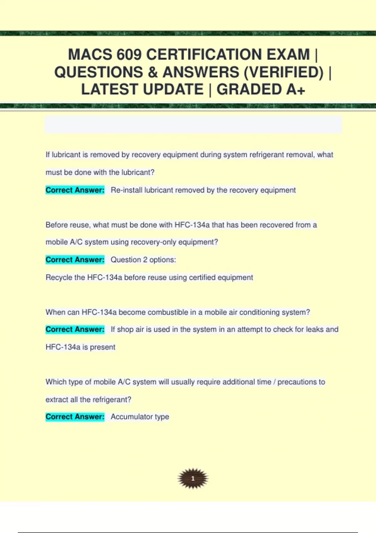 MACS 609 CERTIFICATION EXAM | QUESTIONS & ANSWERS (VERIFIED) | LATEST UPDATE | GRADED A+ If lubricant is removed by recovery equipment during system refrigerant removal, what must be done with the lubricant? Correct Answer: Re-install lubricant removed by the recovery equipment Before reuse, what must be done with HFC-134a that has been recovered from a mobile A/C system using recovery-only equipment? Correct Answer: Question 2 options: Recycle the HFC-134a before reuse using certified equipment When can HFC-134a become combustible in a mobile air conditioning system? Correct Answer: If shop air is used in the system in an attempt to check for leaks and HFC-134a is present Which type of mobile A/C system will usually require additional time / precautions to extract all the refrigerant? Correct Answer: Accumulator type 2 Electronic leak detectors certified to SAE J2791 have the capacity of identifying leakage rates as low as: Correct Answer: 0.15 ounces per year When recovery/recycling equipment is used to remove refrigerant from a mobile A/C system, how much lubricant will be removed during the operation? Correct Answer: Generally, very little, if any Why is it necessary to insure that service port caps containing good seals are installed? Correct Answer: To minimize refrigerant loss Which of the following statements is correct about flushing A/C systems? Correct Answer: Flushing solvents may remain in A/C systems, causing problems When using an HFC-134a refrigerant recovery machine, after competing the first recovery process, how long must you wait, then check the machine's gauges for a rise in pressure above vacuum, which would indicate that the system still contains some refrigerant? Correct Answer: 5 minutes Which type of tank must be used during the transfer of refrigerant? Correct Answer: Question 10 options: Tanks marked DOT 4BA 3 When it has been determined that an A/C system has a low refrigerant charge, what should be done? Correct Answer: Perform a leak detection procedure One effect of some refrigerant gases in the atmosphere is that they: Correct Answer: Contribute to trapping heat Mixing CFC-12 and HFC-134a in the same system will: Correct Answer: Result in refrigerant cross contamination How much moisture is removed from a mobile A/C system during a typical evacuation? Correct Answer: Possibly none Paid technicians who service or repair mobile A/C systems using HFC-22 as refrigerant, or service cargo refrigeration equipment: Correct Answer: Must be Section 608 Type II certified HFO-1234yf is classified as "A2L-mildly flammable." This means: Correct Answer: It can ignite under certain circumstances Section 609 of the Clean Air Act requires that recovery/recycling equipment: Correct Answer: Must be registered with the EP