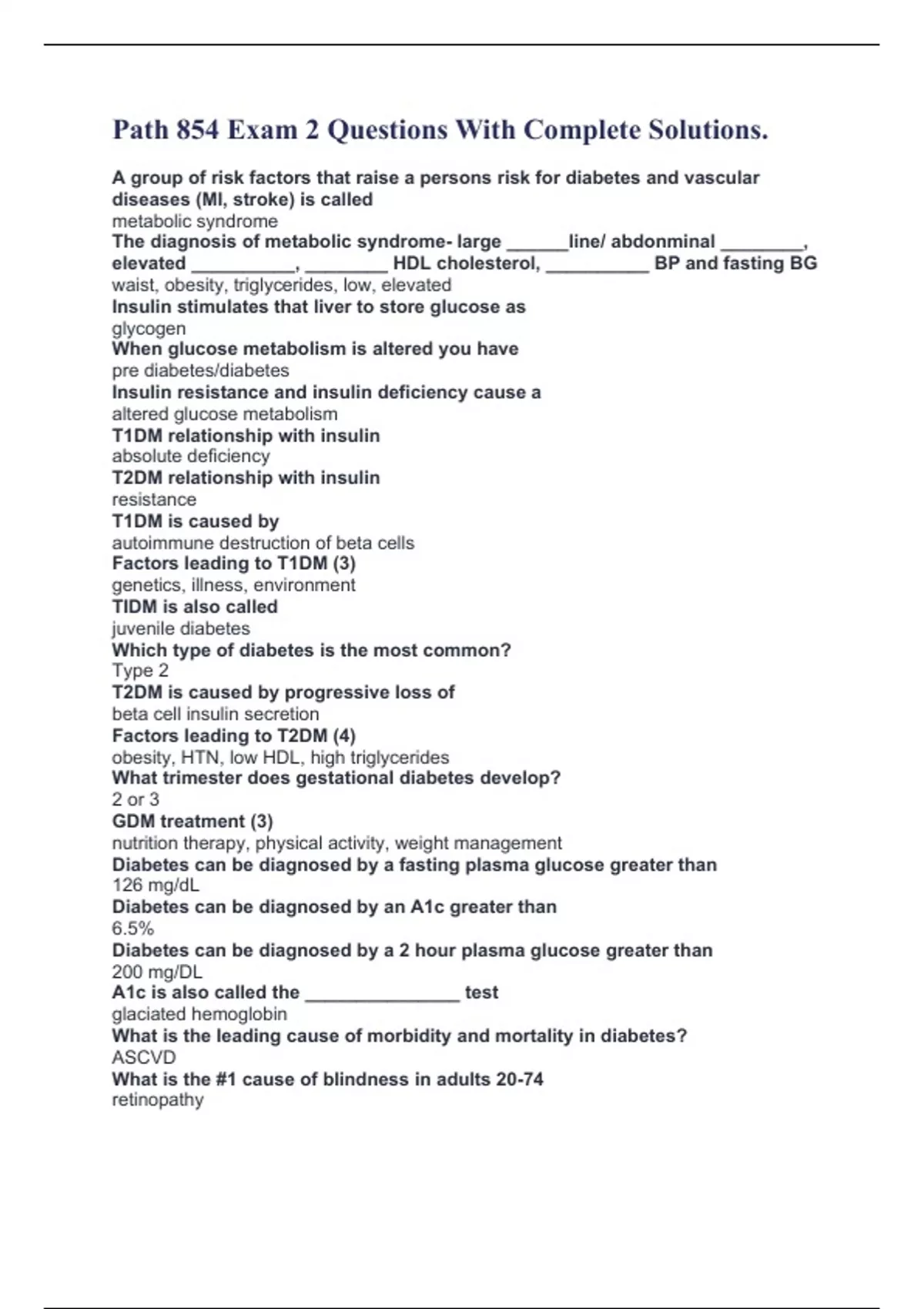 Path 854 Exam 2 Questions With Complete Solutions. A group of risk factors that raise a persons risk for diabetes and vascular diseases (MI, stroke) is called metabolic syndrome The diagnosis of metabolic syndrome- large ______line/ abdonminal ________, elevated __________, ________ HDL cholesterol, __________ BP and fasting BG waist, obesity, triglycerides, low, elevated Insulin stimulates that liver to store glucose as glycogen When glucose metabolism is altered you have pre diabetes/diabetes Insulin resistance and insulin deficiency cause a altered glucose metabolism T1DM relationship with insulin absolute deficiency T2DM relationship with insulin resistance T1DM is caused by autoimmune destruction of beta cells Factors leading to T1DM (3) genetics, illness, environment TIDM is also called juvenile diabetes Which type of diabetes is the most common? Type 2 T2DM is caused by progressive loss of beta cell insulin secretion Factors leading to T2DM (4) obesity, HTN, low HDL, high triglycerides What trimester does gestational diabetes develop? 2 or 3 GDM treatment (3) nutrition therapy, physical activity, weight management Diabetes can be diagnosed by a fasting plasma glucose greater than 126 mg/dL Diabetes can be diagnosed by an A1c greater than 6.5% Diabetes can be diagnosed by a 2 hour plasma glucose greater than 200 mg/DL A1c is also called the _______________ test glaciated hemoglobin What is the leading cause of morbidity and mortality in diabetes? ASCVD What is the #1 cause of blindness in adults 20-74 retinopathy CKD occurs in _________% of diabetics and is the leading cause of _________ renal disease in diabetics 20-40%, end-stage What measures the amount of glucose attached to hemoglobin A1c How long is a RBC lifespan? 3 months Prediabetes is also called impaired fasting glucose What are the 3 "poly" symptoms of diabetes? polyuria, polydipsia, polyphagia Other common symptoms of diabetes are- fatigue, poor ________, frequent _______, vaginal yeast ________, blurred _________, weight ________, pain or numbness in ______ healing, infections, infections, vision, loss, feet hypoglycemia is a BG less than 70 mg/dL What are the 8 main symptoms of hypoglycemia? (S,S,D,C,H,W,H,N) shaky, sweaty, dizzy, confusion, hungry, weak, headache, nervous What occurs when a person is insulin deficient and glucose isn't being used so the liver breaks down fat producing ketones diabetic ketoacidosis A sign of ketoacidosis is fruity breath What are the 3 types of endocrine disorders? (hormone) excess, deficiency, resistance A primary endocrine disorder is an abnormality in the gland A secondary endocrine disorder is an abnormality in stimulation from the pituitary A tertiary endocrine disorder is an abnormality in stimulation from the hypothalamus What are the endocrine axes? hypothalamic hormones and pituitary hormones 3 endocrine axes- hypothalamic-pituitary __________ adrenal, thyroid, gonadal TRH, CRH, GnRH, GHRH are what type of hormones hypothalamic GH, FSH/LH, TSH, ACTH are what type of hormones pituitary T4 is inactive until converted into T3 in the tissues what type of feedback do T3 and T4 exert on the hypothalamus and pituitary? negative feedback Thyroid hormone is stimulated by TRH (thyrotropin releasing hormone) TRH can be influenced by (3) sleep, stress, and temp Inc metabolic rate, neural development, cardio/GI functions, and neuromuscular effects are major actions of... thyroid hormone Are goiters a sign of hypothyroidism or hyperthyroidism? both Thyroid release is ___% of T3 and __% of T4 10%, 90% Actions of the thyroid hormone- promote ________ development, increase _______, and _______ synthesis neural, metabolism, protein congenital hypothyroidism is _________ and can be which type of an endocrine disorder? genetic, primary or secondary Acquired hypothyroidism is usually what type of endocrine disorder? primary Two types of acquired hypothyroidism Hashimoto thyroiditis and thyroidectomy What is the collection of mucopolysaccharide-protein complexes & water in the ECF (causing improper flow of PRO and fluid accumulation)? Myxedema What is caused by an altered mental state caused by cardiovascular collapse? myxedema coma musc weakness, brittle hair, AMS, GI atrophy, constipation, and pallor skin are examples of hypometabolism Two types of hyperthyroidism graves disease and thyroid tumors An autoimmune disorder that overstimulates the thyroid gland Graves disease fine hair, sweating, tachycardia, weight loss are symptoms of hypermetabolism epinephrine and norepinephrine are secreted by adrenal medulla cortisol, corticosterone, aldosterone, and sex hormones are secreted by adrenal cortex The adrenal glands are located on top of the kidneys The adrenal glands function is to secrete stress hormones What is caused when all layers of the adrenal cortex are destroyed? Addison's disease Dark pigmentation, dehydration, weakness, fatigue, and weight loss are symptoms of Addison's disease