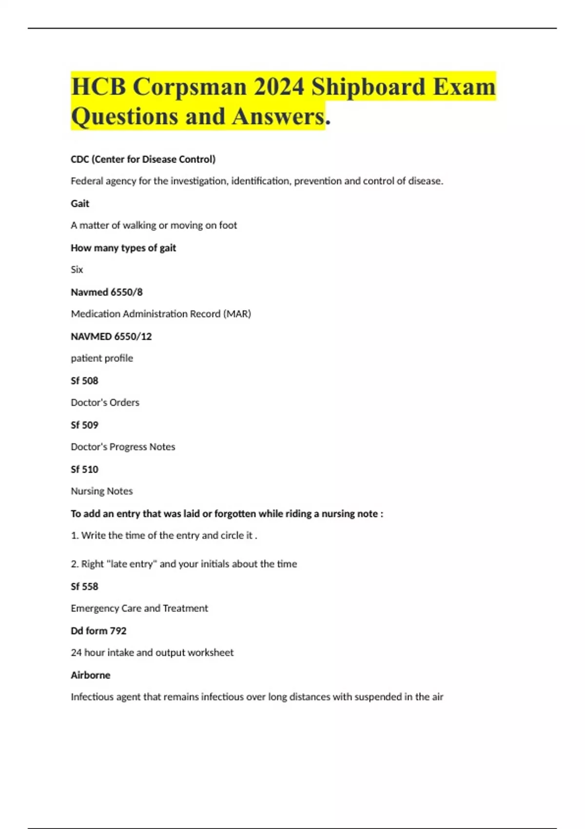 HCB Corpsman 2024 Shipboard Exam Questions and Answers. CDC (Center for Disease Control) Federal agency for the investigation, identification, prevention and control of disease. Gait A matter of walking or moving on foot How many types of gait Six Navmed 6550/8 Medication Administration Record (MAR) NAVMED 6550/12 patient profile Sf 508 Doctor's Orders Sf 509 Doctor's Progress Notes Sf 510 Nursing Notes To add an entry that was laid or forgotten while riding a nursing note : 1. Write the time of the entry and circle it . 2. Right "late entry" and your initials about the time Sf 558 Emergency Care and Treatment Dd form 792 24 hour intake and output worksheet Airborne Infectious agent that r