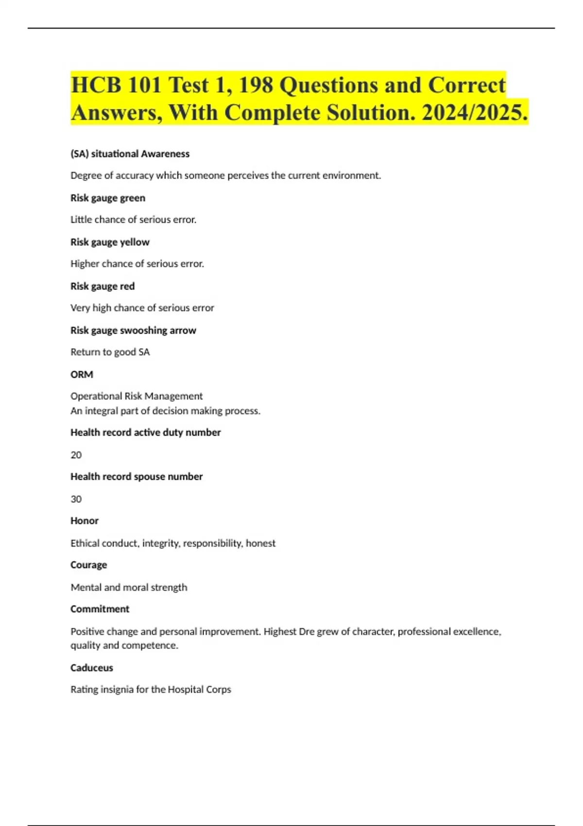 HCB 101 Test 1, 198 Questions and Correct Answers, With Complete Solution. 2024/2025. (SA) situational Awareness Degree of accuracy which someone perceives the current environment. Risk gauge green Little chance of serious error. Risk gauge yellow Higher chance of serious error. Risk gauge red Very high chance of serious error Risk gauge swooshing arrow Return to good SA ORM Operational Risk Management An integral part of decision making process. Health record active duty number 20 Health record spouse number 30 Honor