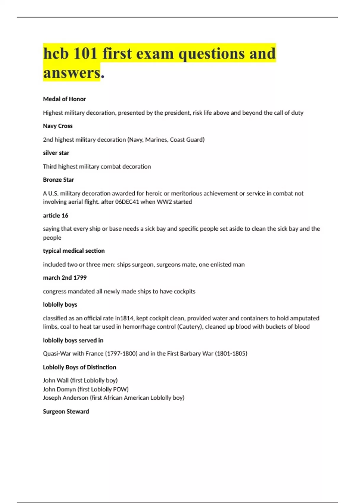 hcb 101 first exam questions and answers. Medal of Honor Highest military decoration, presented by the president, risk life above and beyond the call of duty Navy Cross 2nd highest military decoration (Navy, Marines, Coast Guard) silver star Third highest military combat decoration Bronze Star A U.S. military decoration awarded for heroic or meritorious achievement or service in combat not involving aerial flight. after 06DEC41 when WW2 started article 16 saying that every ship or base needs a sick bay and specific people set aside to clean the sick bay and the people typical medical sectio