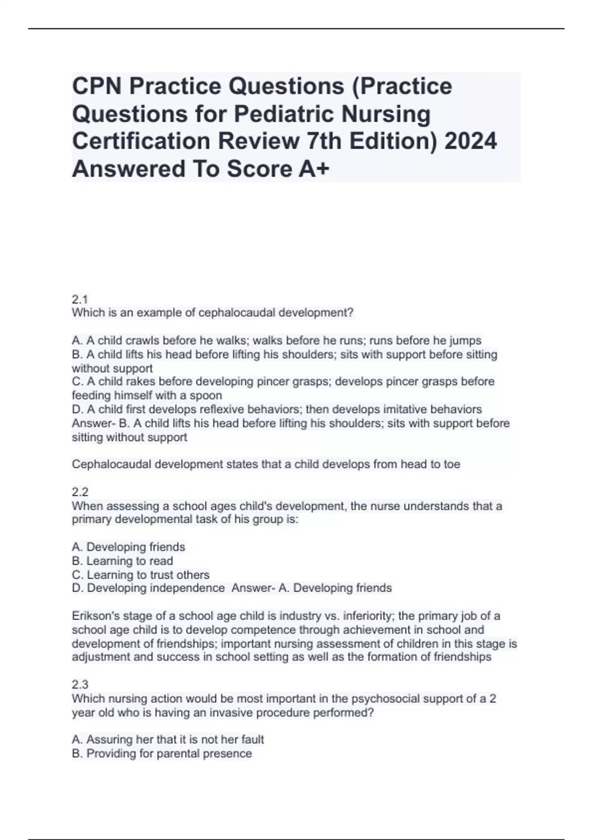 CPN Practice Questions (Practice Questions for Pediatric Nursing Certification Review 7th Edition) 2024 Answered To Score A+