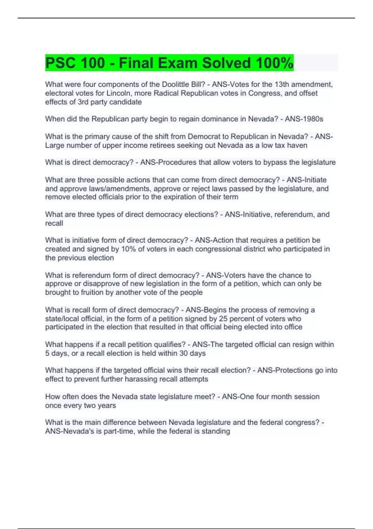 PSC 100 - Final Exam Solved 100%