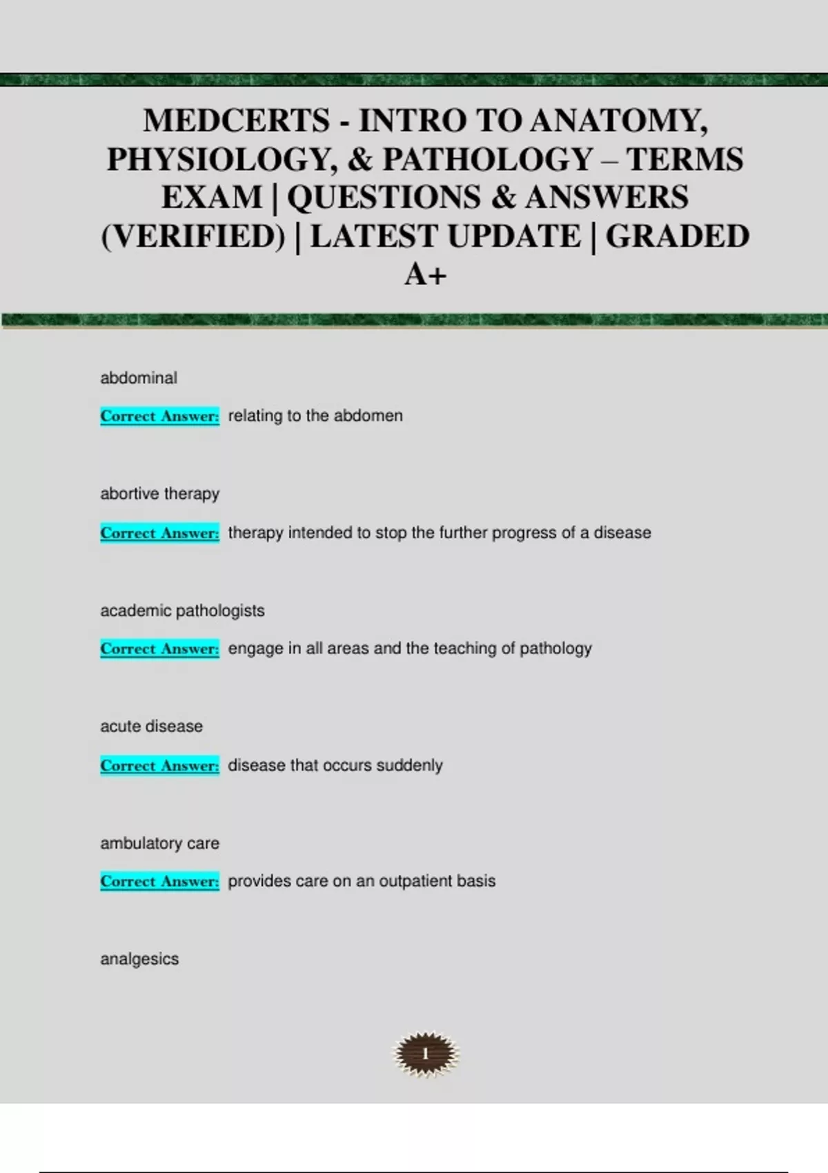 MEDCERTS - INTRO TO ANATOMY, PHYSIOLOGY, & PATHOLOGY – TERMS EXAM | QUESTIONS & ANSWERS (VERIFIED) | LATEST UPDATE | GRADED A+ abdominal Correct Answer: relating to the abdomen abortive therapy Correct Answer: therapy intended to stop the further progress of a disease academic pathologists Correct Answer: engage in all areas and the teaching of pathology acute disease Correct Answer: disease that occurs suddenly ambulatory care Correct Answer: provides care on an outpatient basis analgesics 2 Correct Answer: drugs used to lessen pain anatomical pathologist Correct Answer: performs autopsies and examines tissues and cell preparations anatomy Correct Answer: the study of the structure of the body and its parts anesthetics Correct Answer: drugs that cause a lack of feeling or awareness antacids Correct Answer: drugs that neutralize gastric acid or decrease gastric acid release anterior Correct Answer: closer to the front of the body antiarrhythmics Correct Answer: drugs used to prevent cardiac irregularities antibiotics Correct Answer: drugs that destroy or inhibit bacterial growth 3 anticoagulants Correct Answer: drugs that prevent the formation of blood clots or decrease the formation of existing clots anticonvulsants Correct Answer: drugs used to reduce the number and severity of seizures antidepressants Correct Answer: drugs used to elevate mood antidiabetics Correct Answer: Oral medications to control sugar levels in patients with type II, noninsulin-dependent diabetes antiemetics Correct Answer: drugs used to control nausea, vomiting, and motion sickness