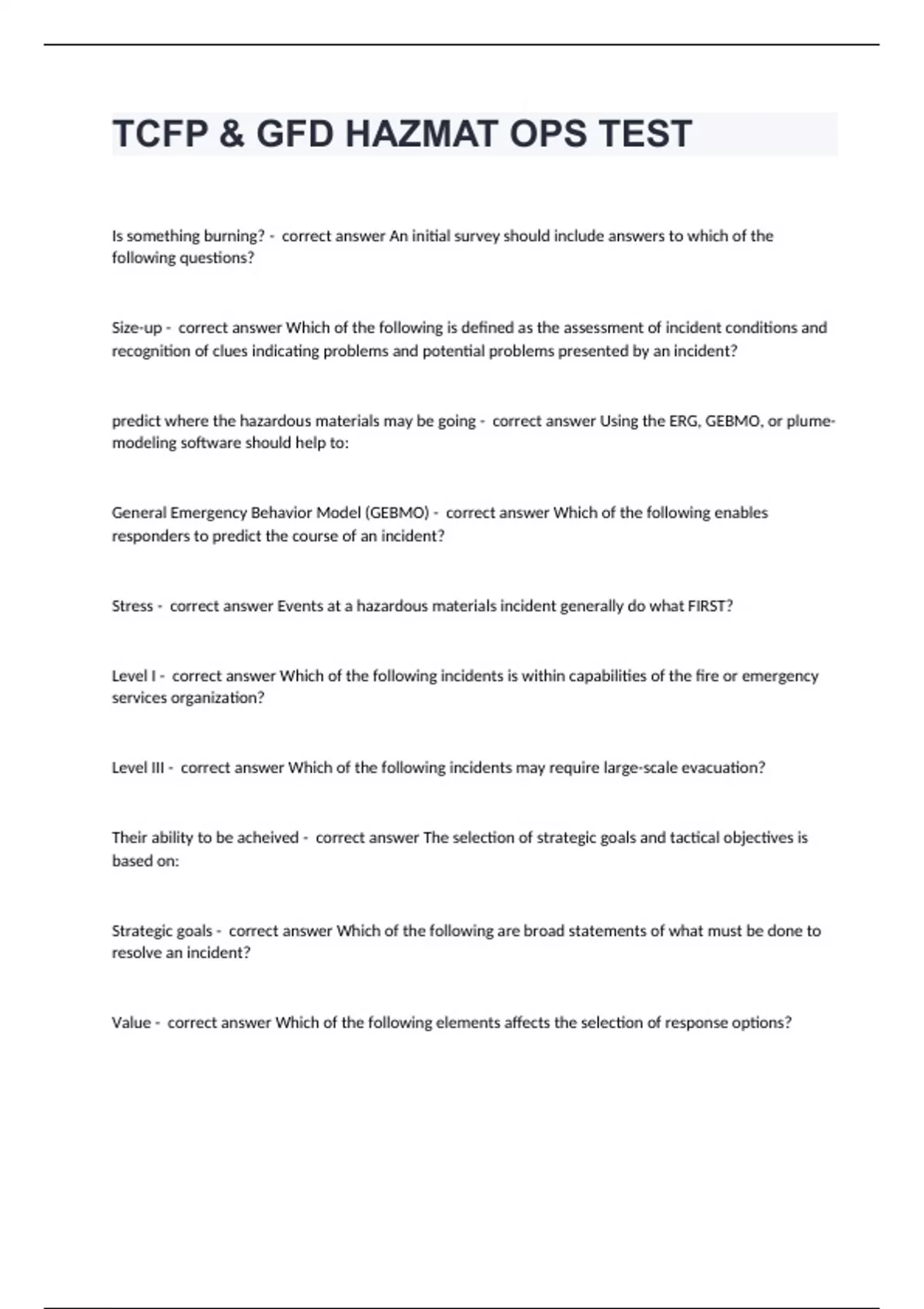 TCFP & GFD HAZMAT OPS TESTIs something burning? - correct answer An initial survey should include answers to which of the following questions? Size-up - correct answer Which of the following is defined as the assessment of incident conditions and recognition of clues indicating problems and potential problems presented by an incident? predict where the hazardous materials may be going - correct answer Using the ERG, GEBMO, or plume-modeling software should help to: General Emergency Behavior Model (GEBMO) - correct answer Which of the following enables responders to predict the course of an incident? Stress - correct answer Events at a hazardous materials incident generally do what FIRST? Level I - correct answer Which of the following incidents is within capabilities of the fire or emergency services organization? Level III - correct answer Which of the following incidents may require large-scale evacuation? Their ability to be acheived - correct answer The selection of strategic goals and tactical objectives is based on: Strategic goals - correct answer Which of the following are broad statements of what must be done to resolve an incident? Value - correct answer Which of the following elements affects the selection of response options?