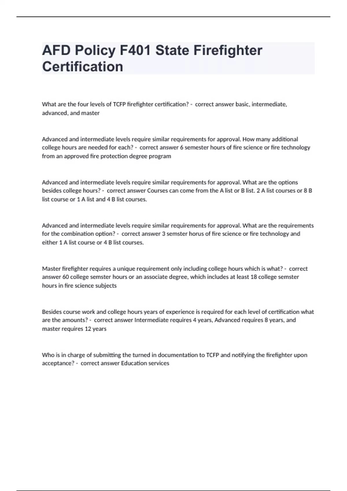 AFD Policy F401 State Firefighter CertificationWhat are the four levels of TCFP firefighter certification? - correct answer basic, intermediate, advanced, and master Advanced and intermediate levels require similar requirements for approval. How many additional college hours are needed for each? - correct answer 6 semester hours of fire science or fire technology from an approved fire protection degree program Advanced and intermediate levels require similar requirements for approval. What are the options besides college hours? - correct answer Courses can come from the A list or B list. 2 A list courses or 8 B list course or 1 A list and 4 B list courses. Advanced and intermediate levels require similar requirements for approval. What are the requirements for the combination option? - correct answer 3 semster horus of fire science or fire technology and either 1 A list course or 4 B list courses. Master firefighter requires a unique requirement only including college hours which is what? - correct answer 60 college semster hours or an associate degree, which includes at least 18 college semster hours in fire science subjects Besides course work and college hours years of experience is required for each level of certification what are the amounts? - correct answer Intermediate requires 4 years, Advanced requires 8 years, and master requires 12 years Who is in charge of submitting the turned in documentation to TCFP and notifying the firefighter upon acceptance? - correct answer Education services